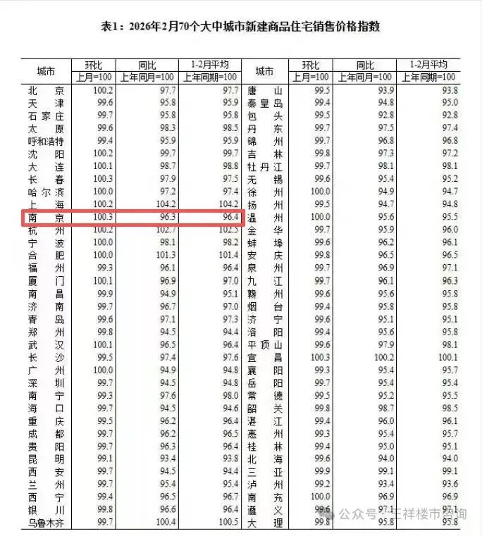 • 国家统计局:2026年2月南京新房价格环比+0.3%,涨幅全国并列第一
