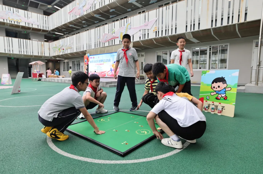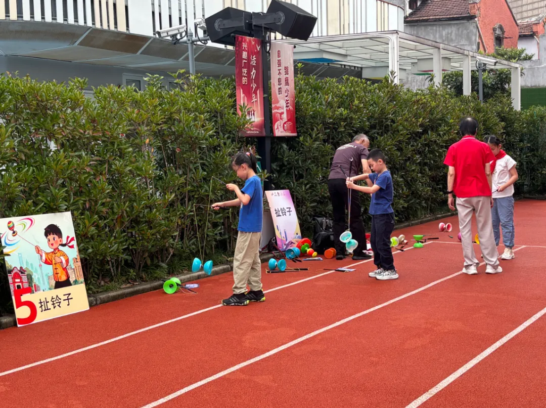 学校操场则变成了社区体育“弄堂欢乐汇”。随着裁判长的哨声响起,“民间艺人们”现场教学,带来了精彩的扯铃子展示,让师生们大开眼界。学生们分组PK“打弹子”“滚圈子”“抽陀子”,亲身体验传统民俗游戏的独特魅力。在游戏中,学生们不仅增强了对传统文化的认同感和传承意识,还进一步提升了对运动的兴趣与参与度。