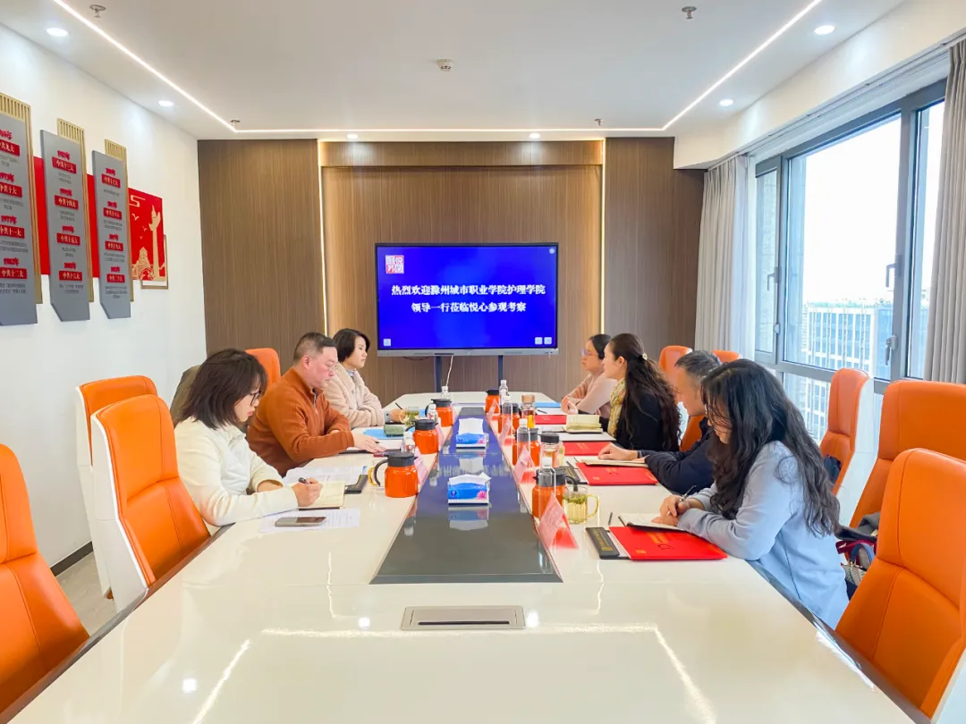 12月10日下午,滁州城市职业学院护理学院院长金虹带队到访我司。该院副院长李勋华、健康管理系副主任傅娴及专业负责人周方方等随行。集团副总经理、悦心学院院长哈曼热情接待。董事长助理、办公室主任茅洋,人力资源部主管陈琳等参加活动。双方围绕养老与家政行业经验、康养人才培养以及校企协作机制等议题开展了深入交流和务实研讨,就进一步推动产学研协同、加强人才共育达成了广泛共识。
