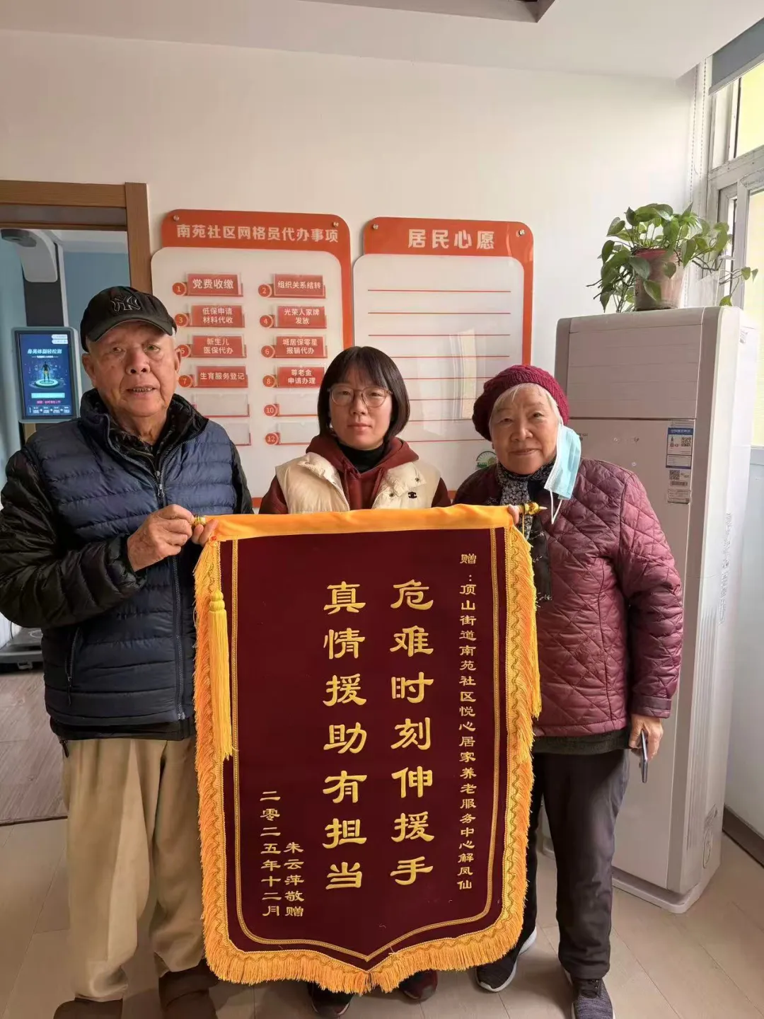 12月12日中午时分,顶山街道南苑社区悦心居家养老服务中心员工解凤仙接到了老人朱云平的呼救信息。她迅速赶往老人家中,发现其90多岁的老伴祁爷爷正突发高烧,体温已飙升至39.8℃,且意识呈模糊状态。解凤仙表现得沉着冷静,她一边耐心安抚家属情绪,一边紧急联系老人子女,并迅速拨打了120急救电话,同时还协助家属整理好了相关证件。待救护车抵达后,解凤仙与家属一同细心照料老人,直至送往医院。因救助及时,老人经治疗已康复。事后,老人家属专程赠送锦旗以表感谢。