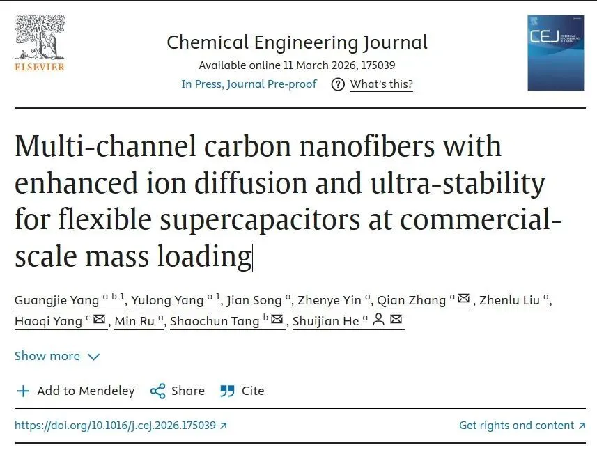 近日,南京林业大学张倩副教授、何水剑教授团队与南京大学唐少春教授,扬州大学杨皓奇副教授合作在《Chemical Engineering Journal》期刊上,发表了最新研究成果“Multi-channel Carbon Nanofibers with Enhanced Ion Diffusion and Ultra-Stability for Flexible Supercapacitors at Commercial-Scale Mass Loading”。该研究引入了一种新颖策略,将电纺与相分离、配位化学及原位模板相结合,合成具有“类藕杆”仿生结构——交叉联通多通道结构的碳纳米纤维(CNF),这些纤维具有增强的电子导电性和高效的离子扩散特性。独特的交叉连接多通道结构最大化了电极与电解质的界面,而梯度孔隙工程有效缓解了碳电极中常见的动力学限制。该设计使离子扩散系数提升了三个数量级,显著提升了速率能力并优化了活性位点的利用率。