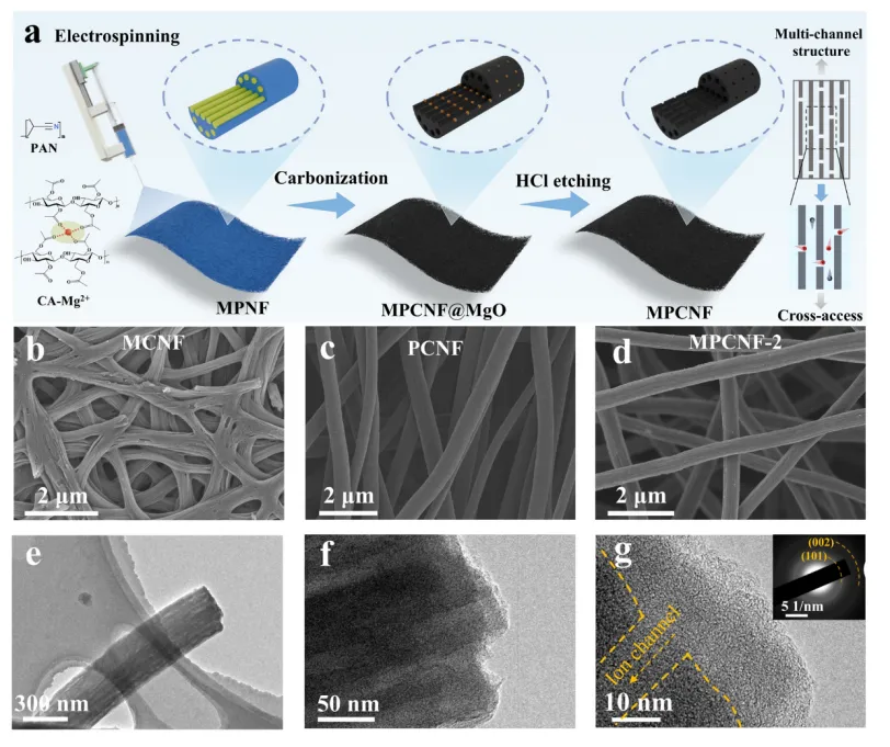 图1:(a)MPCNF-x合成路径的示意图。(b)MCNF、(c)PCNF和(d)MPCNF-2的SEM图像。(e-f)MPCNF-2的TEM图。(g)MPCNF-2的SAED图像。