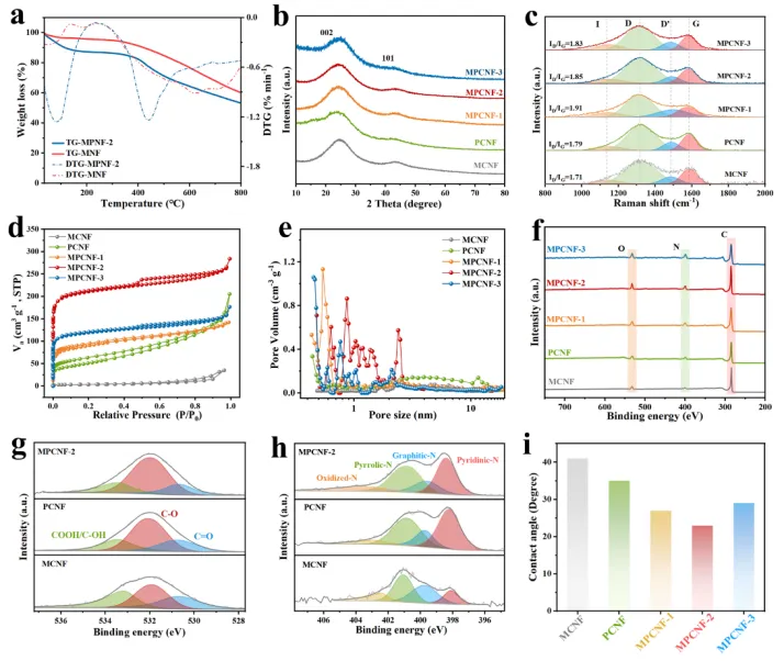 图2:(a) MPNF-2的TG-MS曲线。(b) XRD图谱。(c)CNF的拉曼光谱。(d)CNF的N2吸附/脱附等温线。(e)孔径分布曲线。(f)CNFs的XPS光谱。高分辨率(g)O1s XPS光谱,(h)MCNF、PCNF和MPCNF-2的N 1s XPS光谱。(i) CNF的动态接触角测试。
