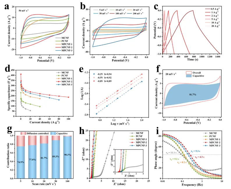 图3:三电极系统的电化学性质评估。(a)基于CNF的SC在50 mV s-1扫描速率下的CV曲线。(b)基于MPCNF-2的SC在不同扫描速率下的CV曲线。(c)基于MPCNF-2的GCD曲线为0.5-20 A g-1(d)倍率性能。(e)log i与log v之间的线性关系。(f)MPCNF-2在不同扫描速率下的扩散控制和表面电容控制电容。(g)不同扫描速率下,扩散电容与表面电容贡献的比例。(h)奈奎斯特图。(i)相角与频率关系图。