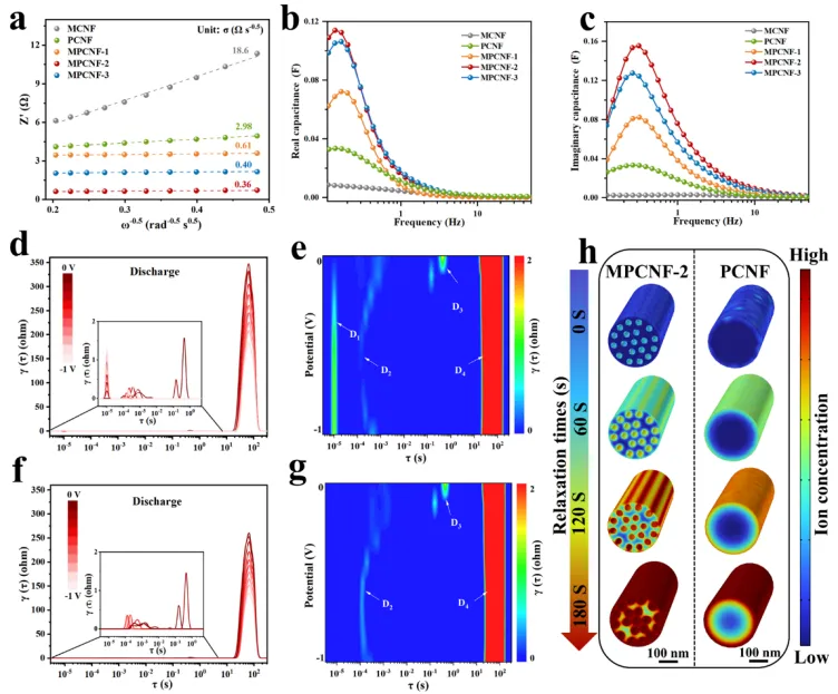 图4:(a)Z' 与 ω−0.5 之间的关系。(b)实电容 和(c)虚电容值与频率关系图。(d-e)基于PCNF和(f-g)MPCNF-2的SCs放电过程DRT图。(h)PCNF和MPCNF-2有限元模拟下的K+浓度分布。