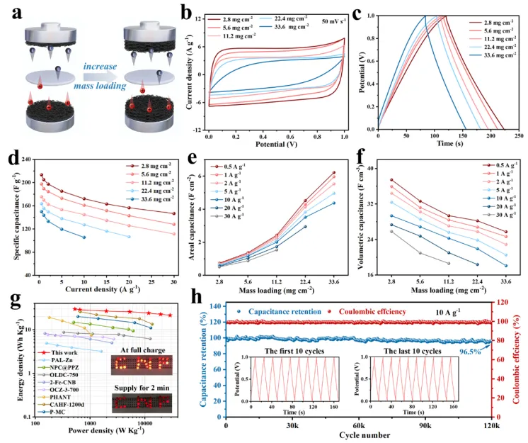 电动汽车和大规模储能系统的快速发展进一步加速了对先进电化学储能技术的需求。超级电容器(SC)以其快速的充放电速率、长周期寿命和卓越的安全性而闻名,被广泛认为是最有前景的储能技术之一。然而,传统的碳基SCs的实验室与工业化之间仍存在显著差距,尤其是在电极的低面积和体积电容方面,这仍是SC商业化的主要障碍。因此,在保持优异的电容性能的同时实现高质量负载,是现实应用中的紧迫瓶颈。