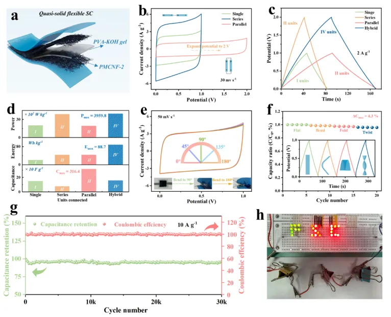 为了进一步提升MPCNF-2电极的实用性,用PVA/KOH凝胶电解质组装SC进行评估。结合MPCNF-2电极本身的柔韧性,组装后的器件展现出优异的机械顺应性和电化学稳定性,同时适应多种机械变形模式。如图6e所示,柔性对称SC的CV曲线在0°-180°的弯曲角范围内基本保持不变,对应的GCD曲线在变形下几乎重叠,显示了该器件卓越的机械稳定性。本研究通过静电纺丝、相分离、配位化学和原位模板的结合,获得具有梯度多孔结构的多通道CNF。通过凝胶电解质的耦合,使柔性固态超级电容器受益,实现了更高的机械柔韧性和更高的电容,展现了巨大的实用潜力。