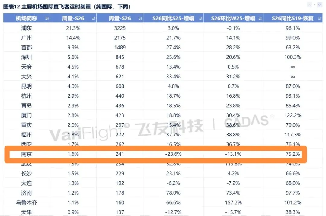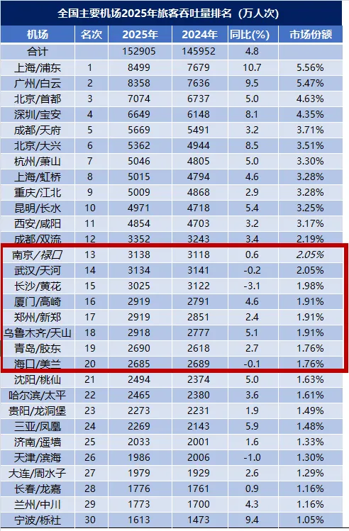 南京虽然2025年勉强进入中国大陆按城市口径计算的机场吞吐量前十,但领先后七名并不十分明显,尤其是厦门、乌鲁木齐、长沙等地新机场或新跑道即将投入运营,明后年放量属于大概率事件,南京机场跌破前十也属于大概率情况。