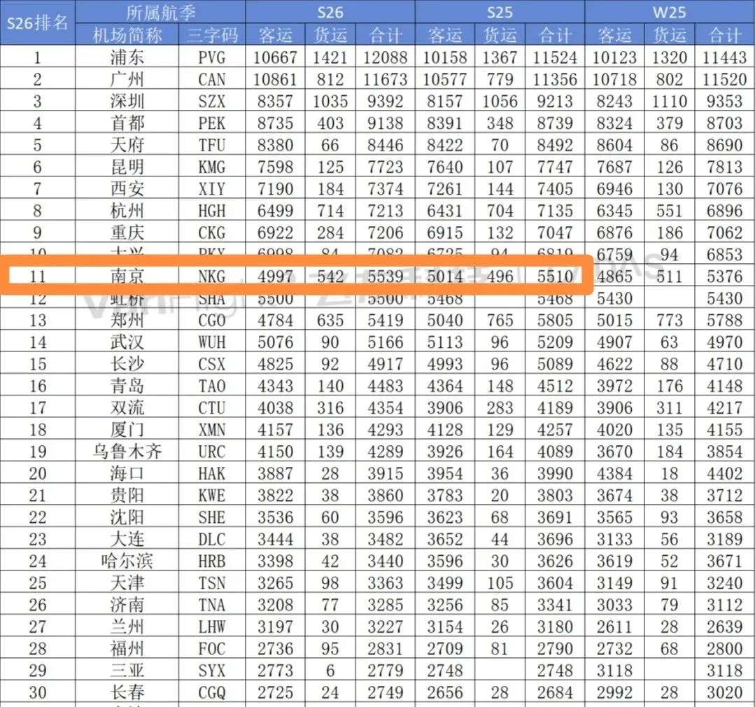 根据cadas统计的数据,3月底即将开始的新航季,南京机场客运计划航班量相对2025年同期继续下跌,仅货运航班量增长,客货运整体微增0.5%。