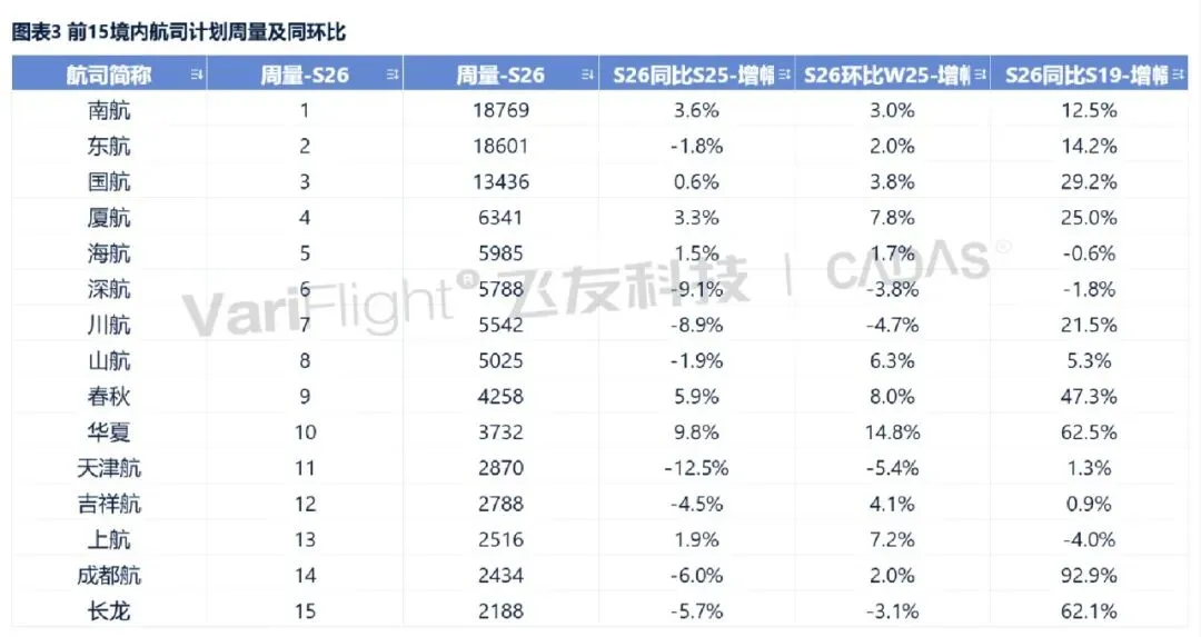新航季,航班计划显示一半左右航司全市场整体运力增加,一半负增长,说明市场有结构性机会。其中南航系和春秋系等航司整体计划航班量增加,而南京机场的三家基地公司全部是负增长。