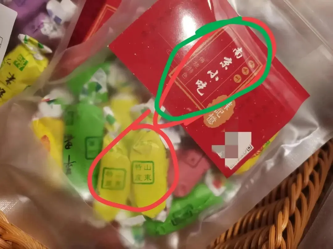 前段时间山东的朋友来南京,我陪他去夫子庙时去了这家店,朋友眼尖很快发现了问题。这些饴糖很明显是山东特产,上面都还写作“山东特产”字样,却被这家店换了个外包装作为“南京小吃”出售。