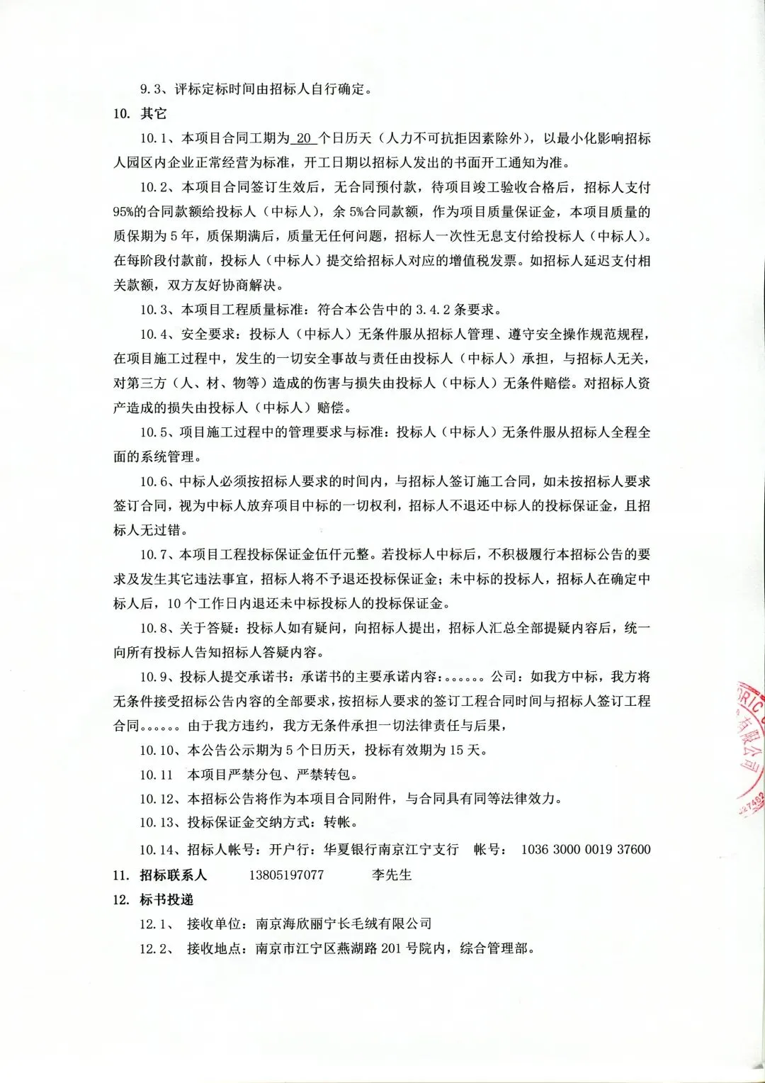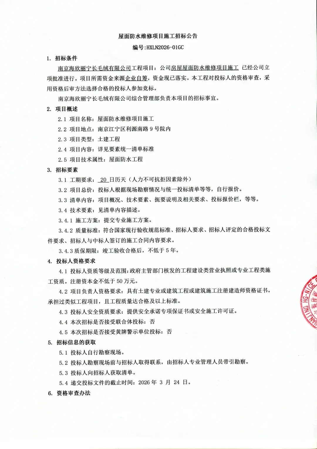 南京海欣丽宁长毛绒有限公司屋面防水维修项目施工招标公告