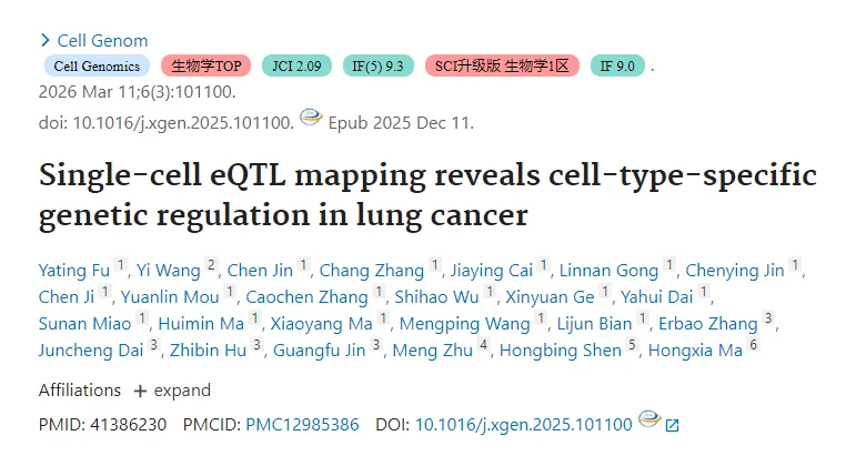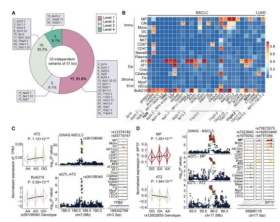 为深化对肺癌GWAS位点理解,整合多源数据,从31个位点选33个变异,经数据库整合鉴定出127个分4级的候选致病基因。一级28个基因呈现复杂细胞特异调控模式,如部分在上皮或免疫细胞共定位,有的在不同细胞有相反信号,还有的广泛调控。同时发现肺癌相关变异可跨细胞调控多基因,近四分之一易感位点与多个候选基因共定位,凸显sc-eQTL分析对揭示肺癌遗传易感性机制的关键作用(图5)。