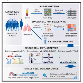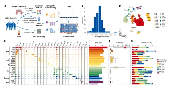 研究在LungSCeQTL队列,探究遗传变异对基因表达的细胞特异性影响。队列含2021.10-2022.7因肺癌或非肿瘤肺病行肺切除的226名中国人,采集样本并基因分型,经质控和填补后得4,838,930个SNPs。肺组织解离后用混合策略测870,061个细胞scRNA- seq,评估批次效应。最终保留222人 562,255个细胞,均2,533个/供体,供体无亲缘,年龄、性别及吸烟情况各异(图2)。