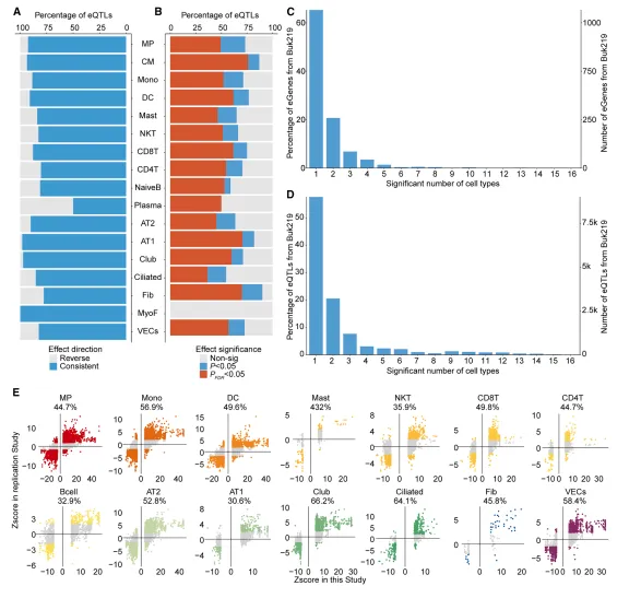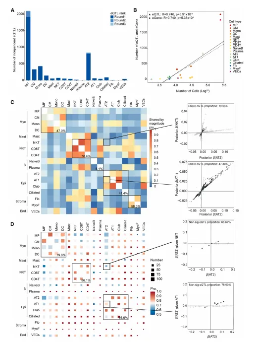 图3:在中国肺癌SCeQTL队列中跨细胞类型绘制eQTL图谱。