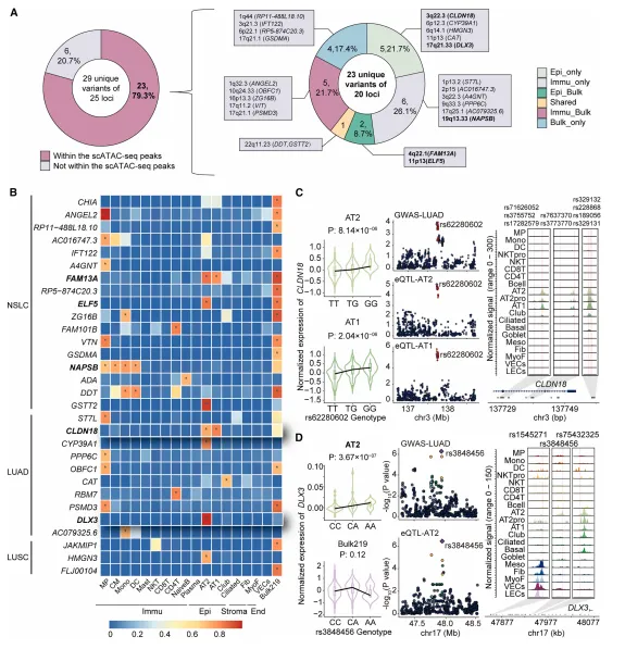 为从细胞层面找更多肺癌易感基因,开展TWASs,鉴定出250个相关基因,经共定位分析得30个易感基因,多数相关变异在对应细胞的snATAC-seq 峰内。近半新基因在免疫细胞共定位,部分来自上皮细胞,部分位点在欧洲人群获验证。DLX3作为新基因,其变异影响LUAD风险,功能分析显示它调控 AT2细胞状态。此外,rs4822455在不同细胞与不同基因共定位,体现遗传变异多效性,共同影响肺癌易感性(图6)。