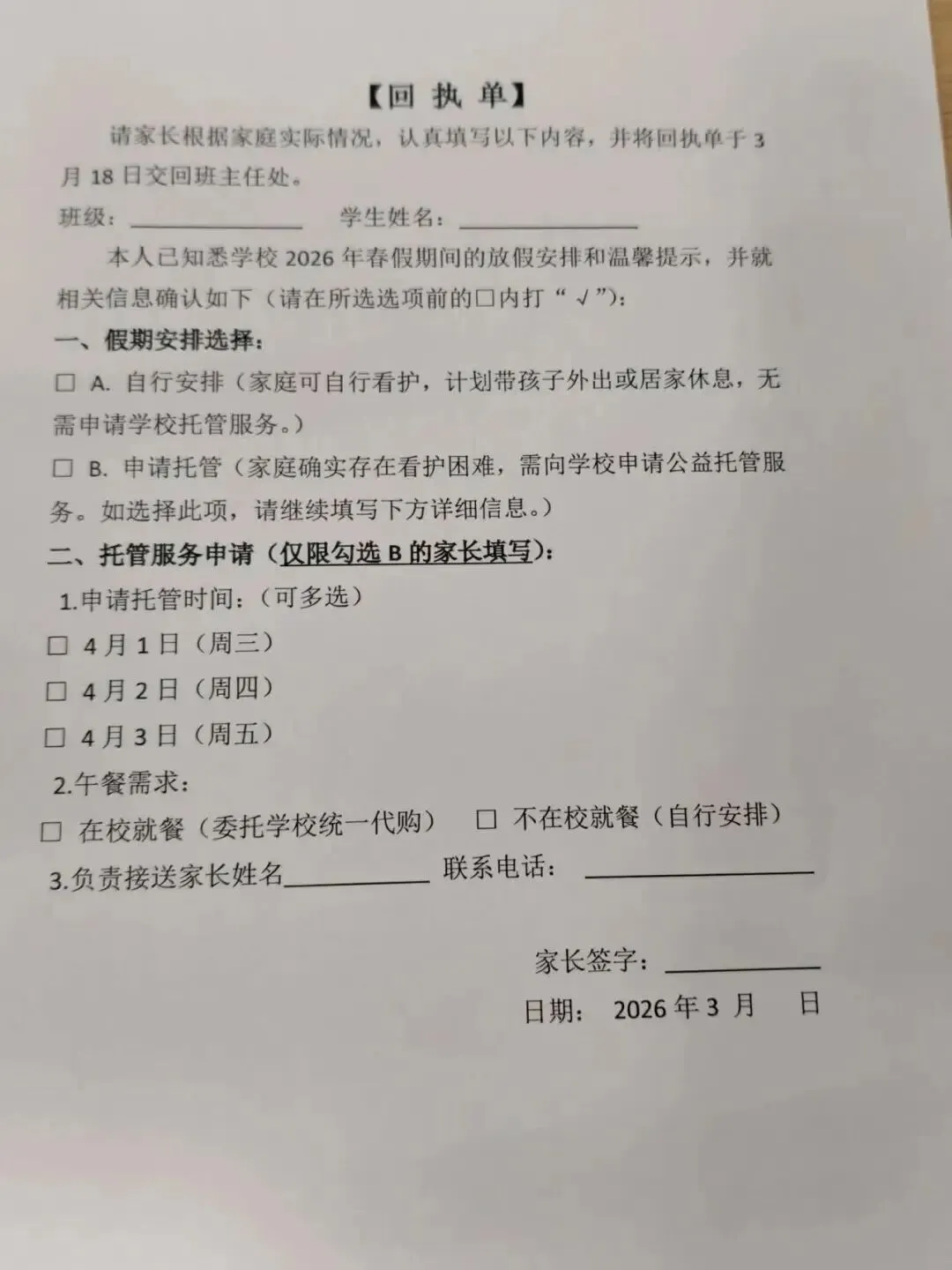 南京已有学校发春假回执单。有托管需求的学生家庭,可以自主申请一天、两天或三天的托管。托管期间不收取托管服务费,学生用餐费用按规定收取。