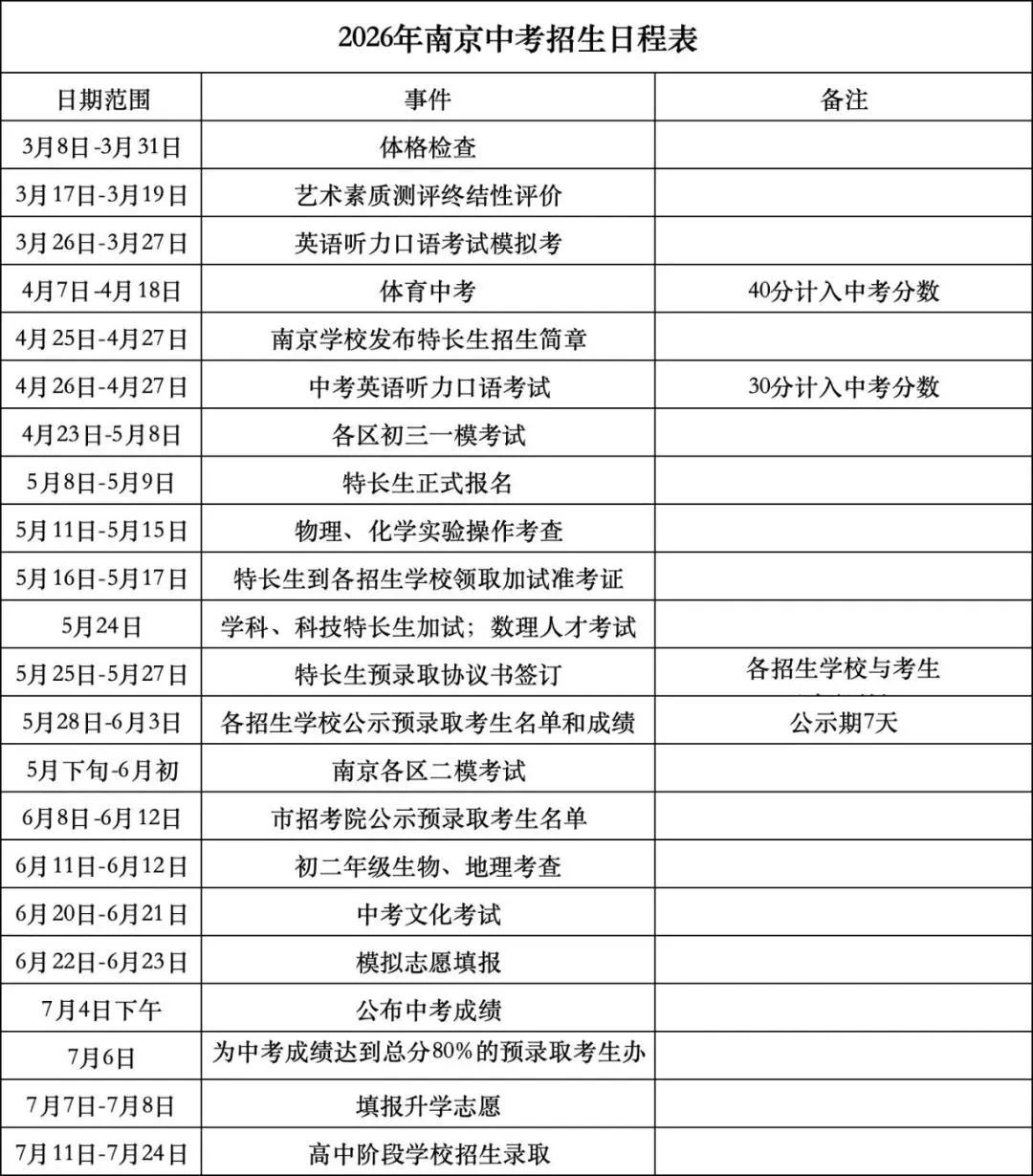 以下是南京某校发布的2026年中考招生日程表(*图源网络,仅供参考)