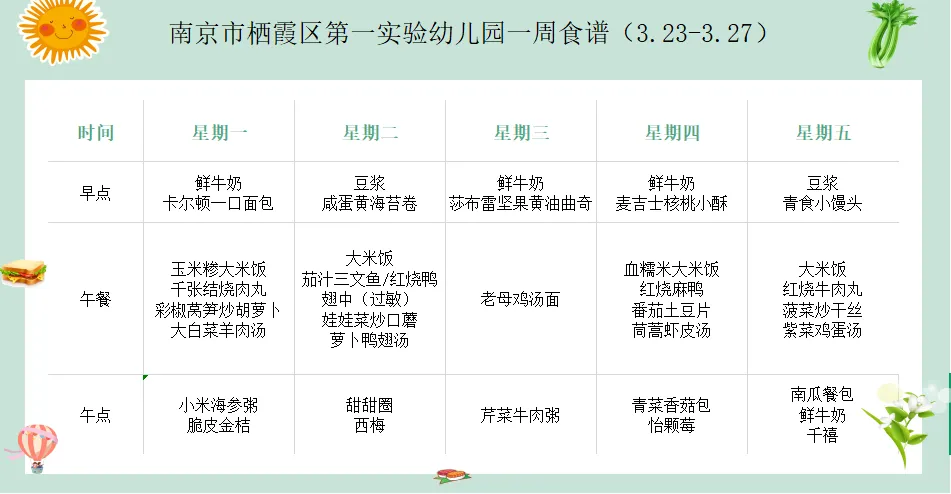 >【畅美食刻】南京市栖霞区第一实验幼儿园一周食谱(3.23—3.27)