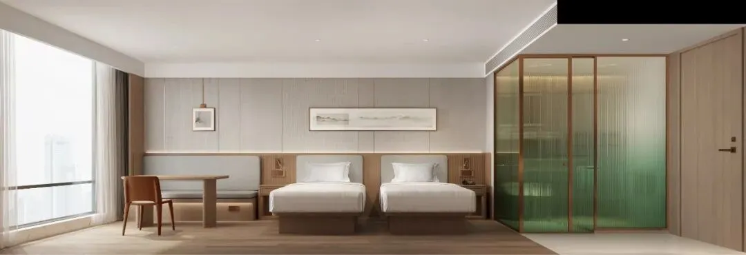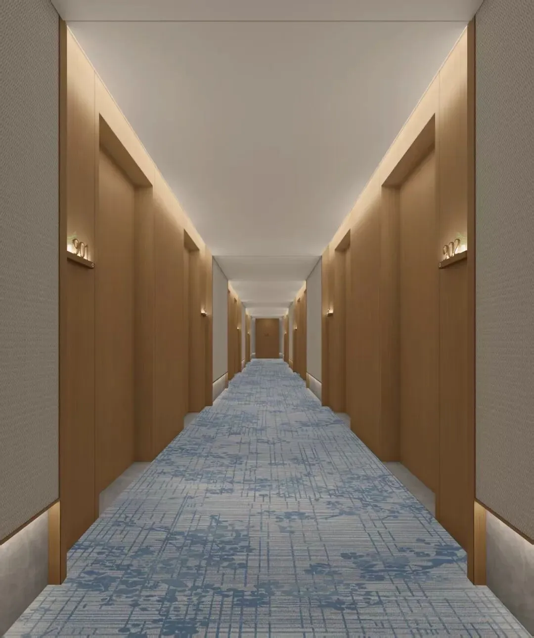 在细节设计中,通过地毯纹样、房号装置与小型绿植等元素,将自然意象轻轻嵌入日常动线,使空间在克制中保留温度。这些细节共同构成一种安静而耐看的东方生活气质。