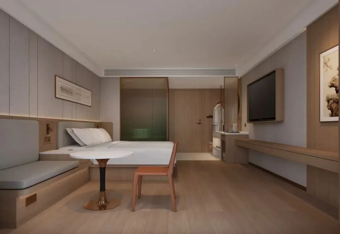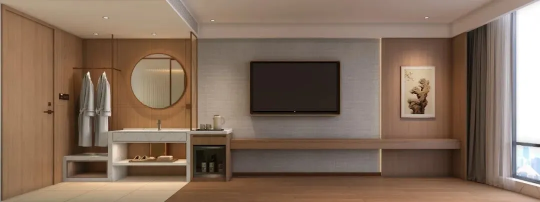 客房以整合与连续为核心逻辑。通长木作系统将电视背景、洗手台与收纳整合为统一界面,减少空间割裂。床头区域采用围合式设计,强化居住的包裹感与安全感。这种空间逻辑使客房在紧凑尺度中依然保持舒适与从容。