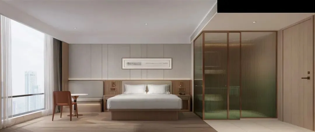 温润材质中的秩序表达,酒店整体材料体系以木饰面、石材与暖灰色系为核心基调。