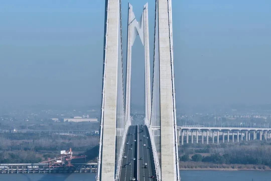 中铁大桥局承建了大桥跨江主桥北主塔及北引桥第一联施工。大桥北主塔设计采用门形框架混凝土结构,由下塔柱、中塔柱、上塔柱、下横梁、上横梁及塔顶鞍罩几部分组成。