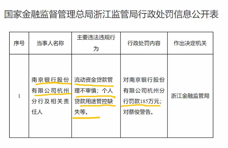 就在南京银行宣布要接收烟草公司94亿存款的同一天,另一条消息也出来了:南京银行杭州分行被浙江金融监管局罚款185万元。