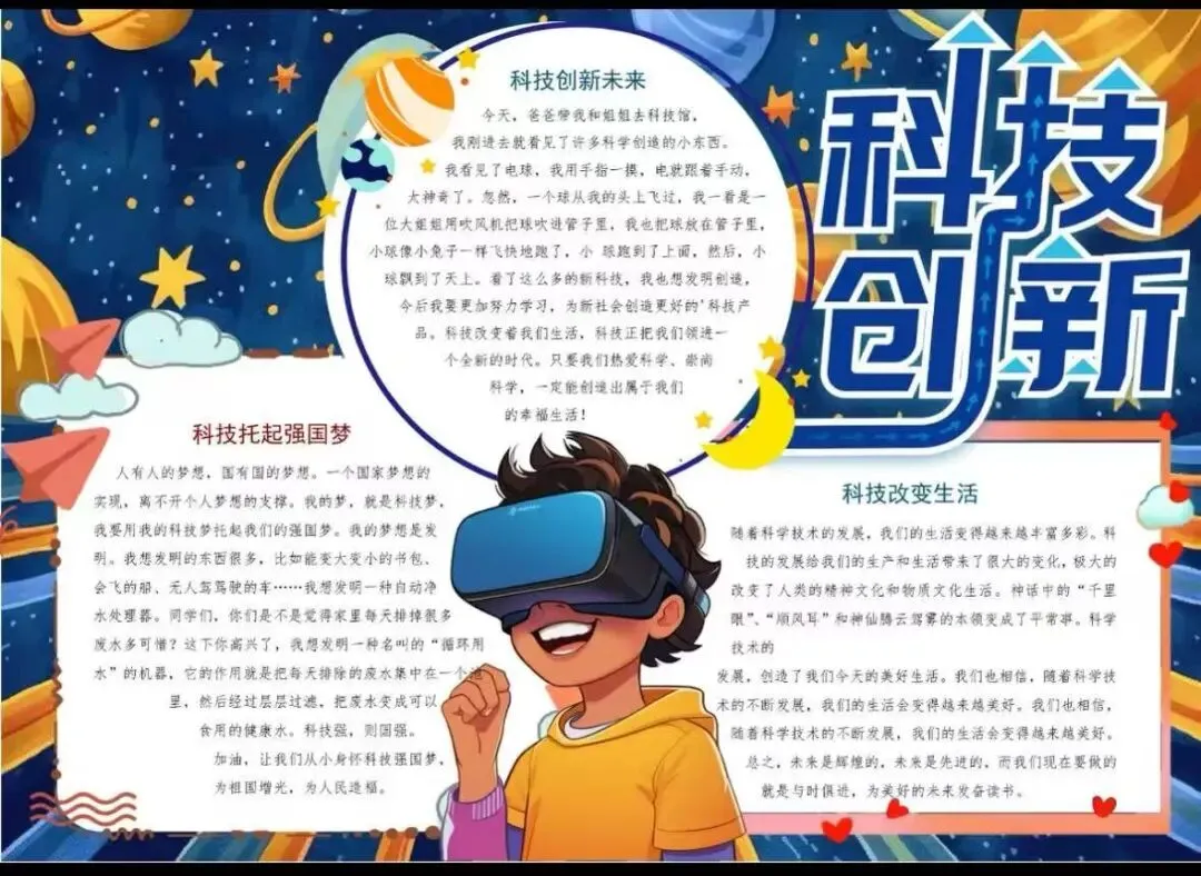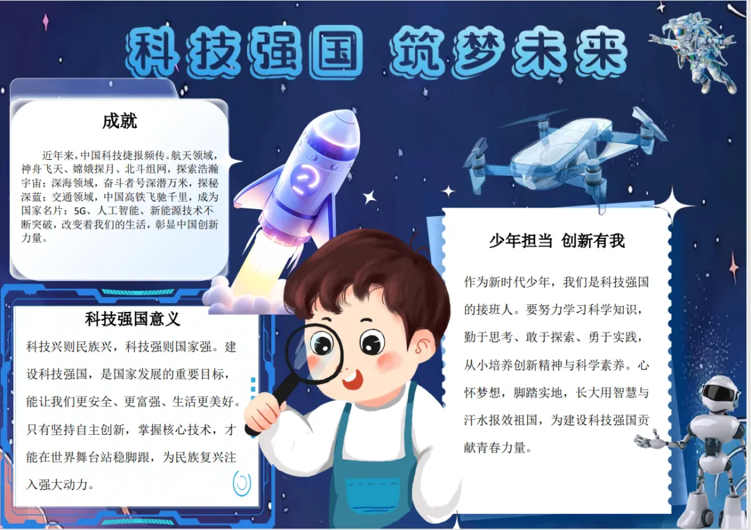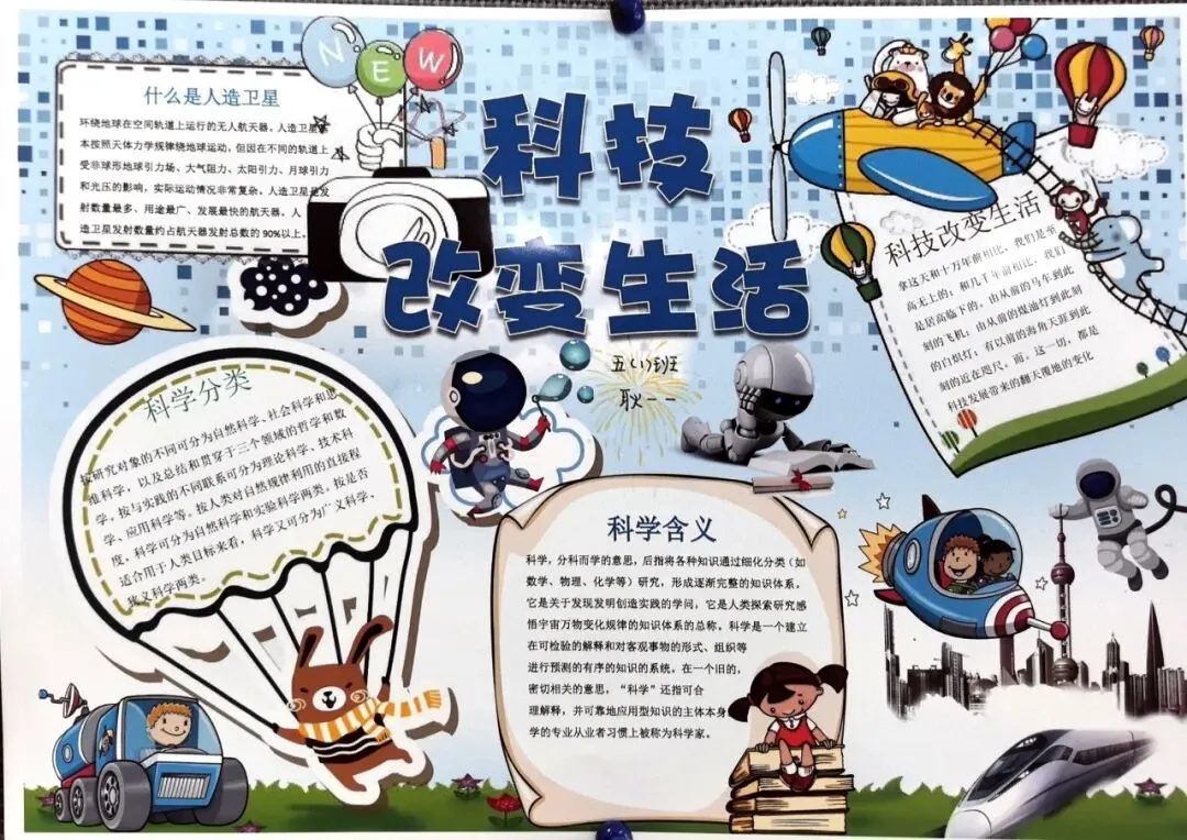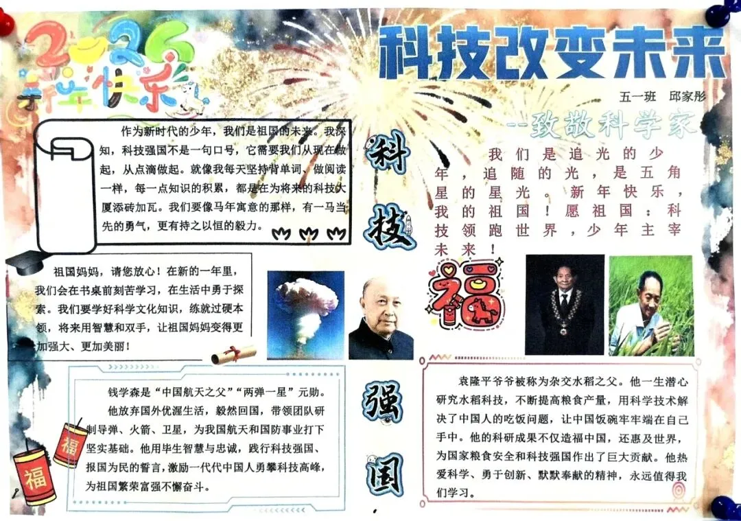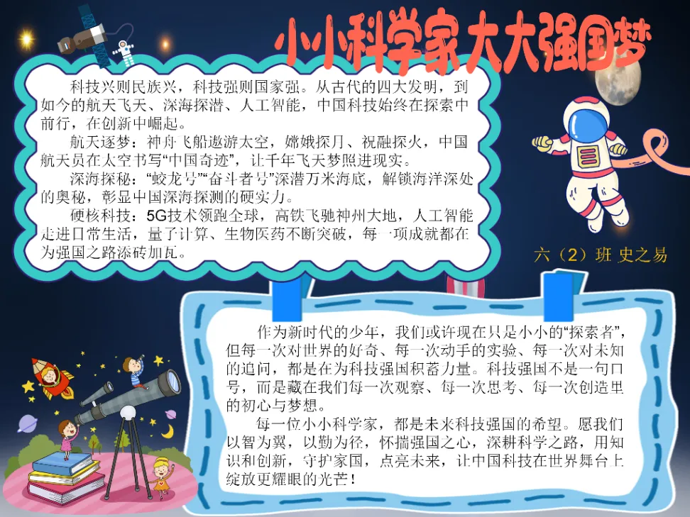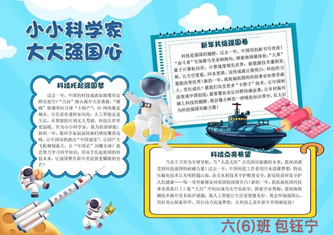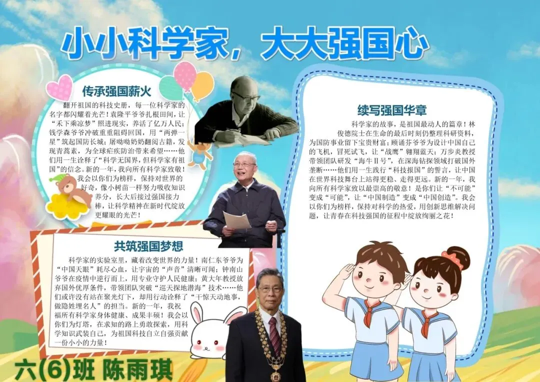 五、六年级的“小小科学家”们则围绕“科技强国”“致敬科学家”等主题制作了排版精美的电子板报。