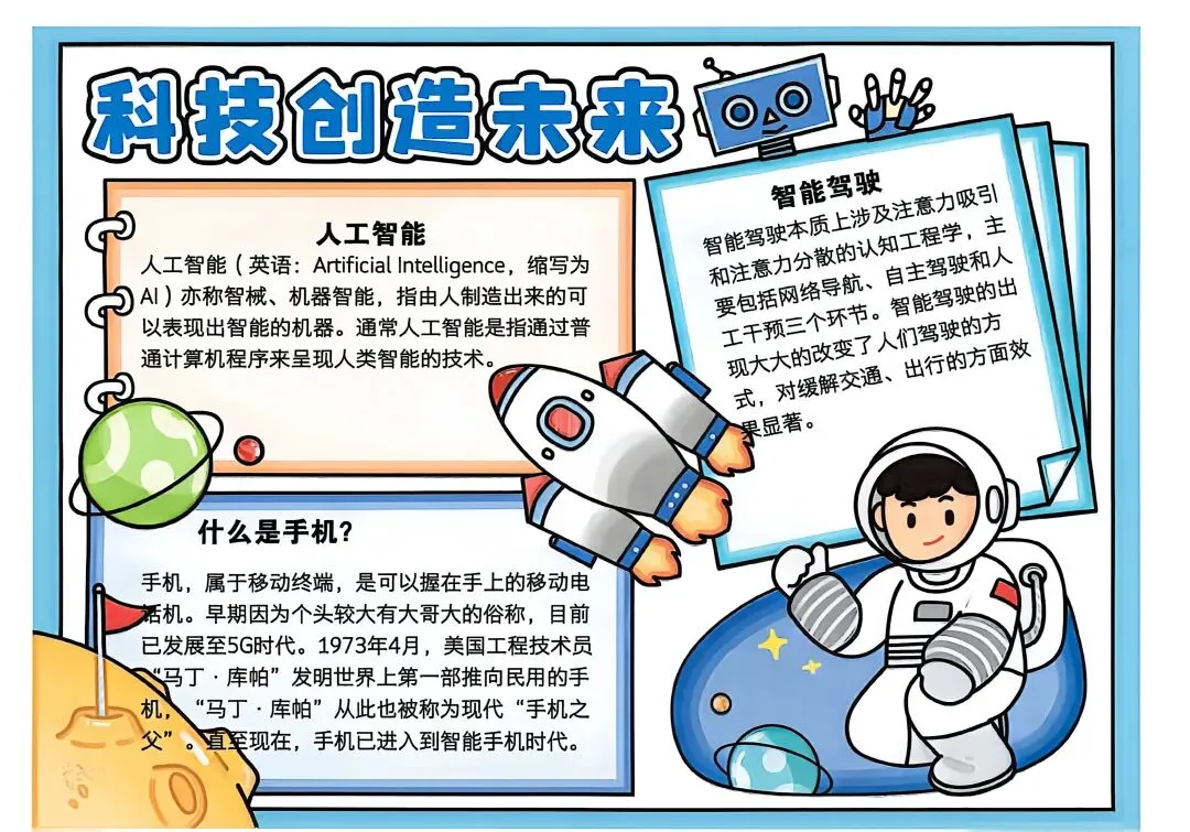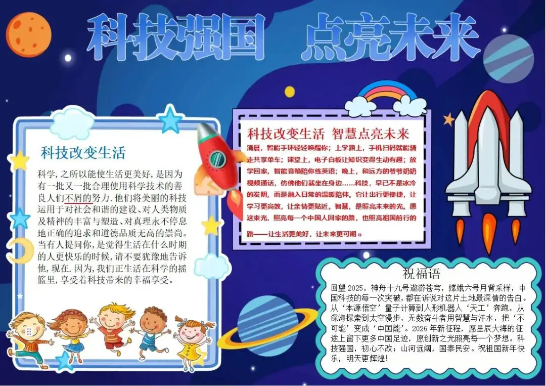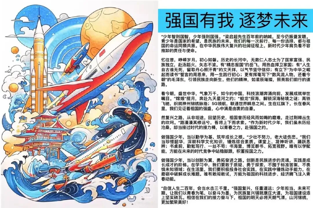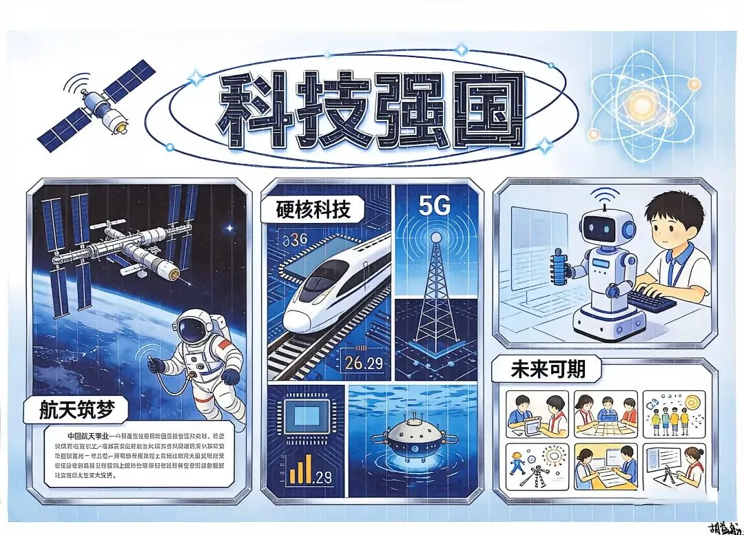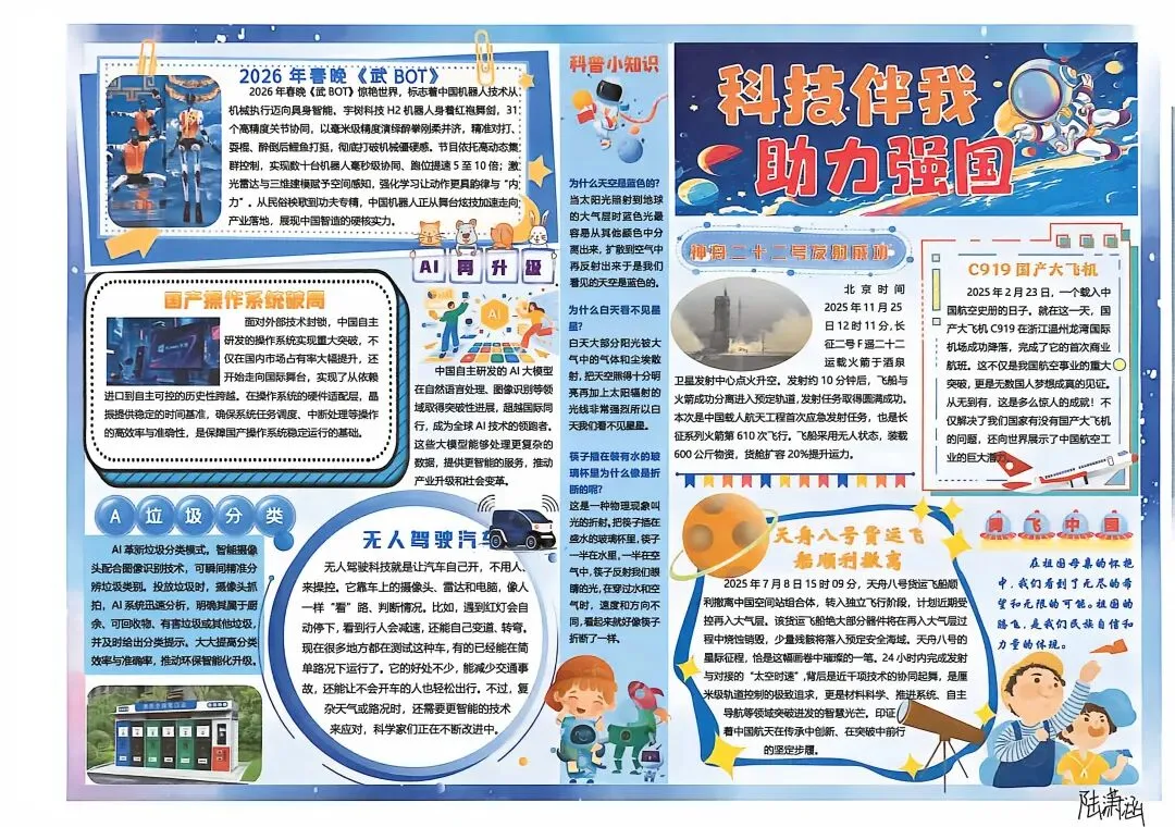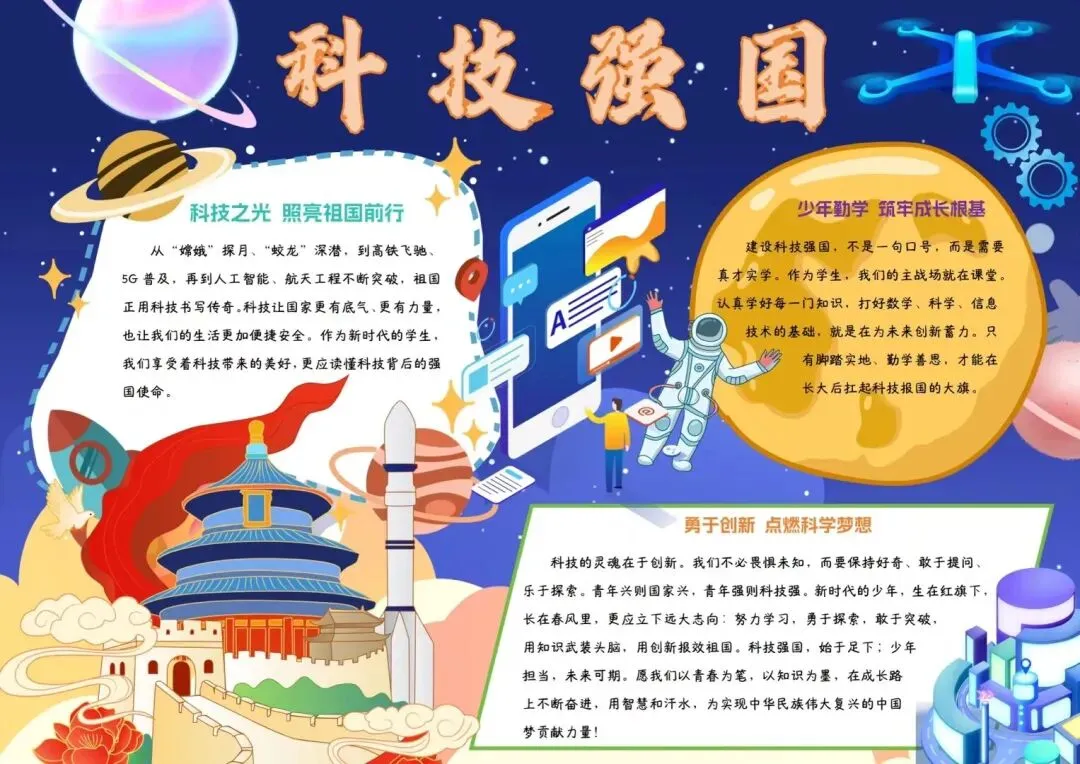 五、六年级的“小小科学家”们则围绕“科技强国”“致敬科学家”等主题制作了排版精美的电子板报。