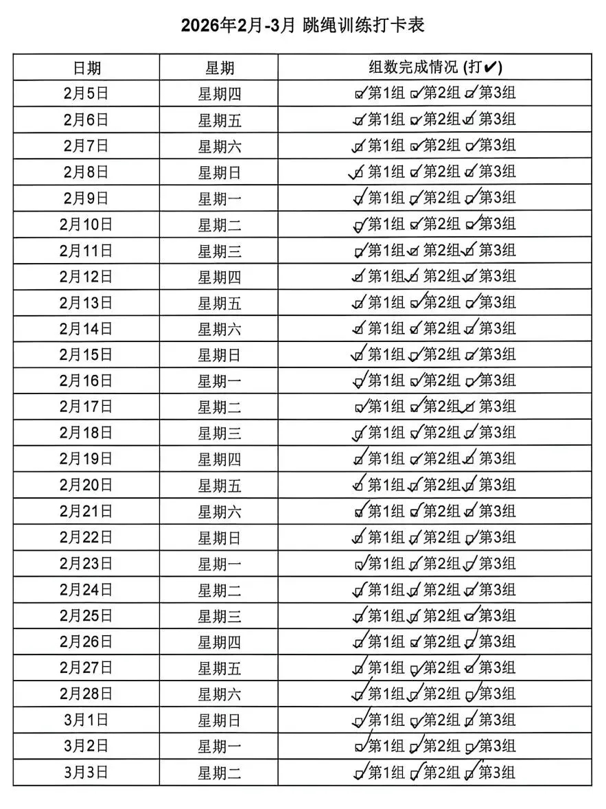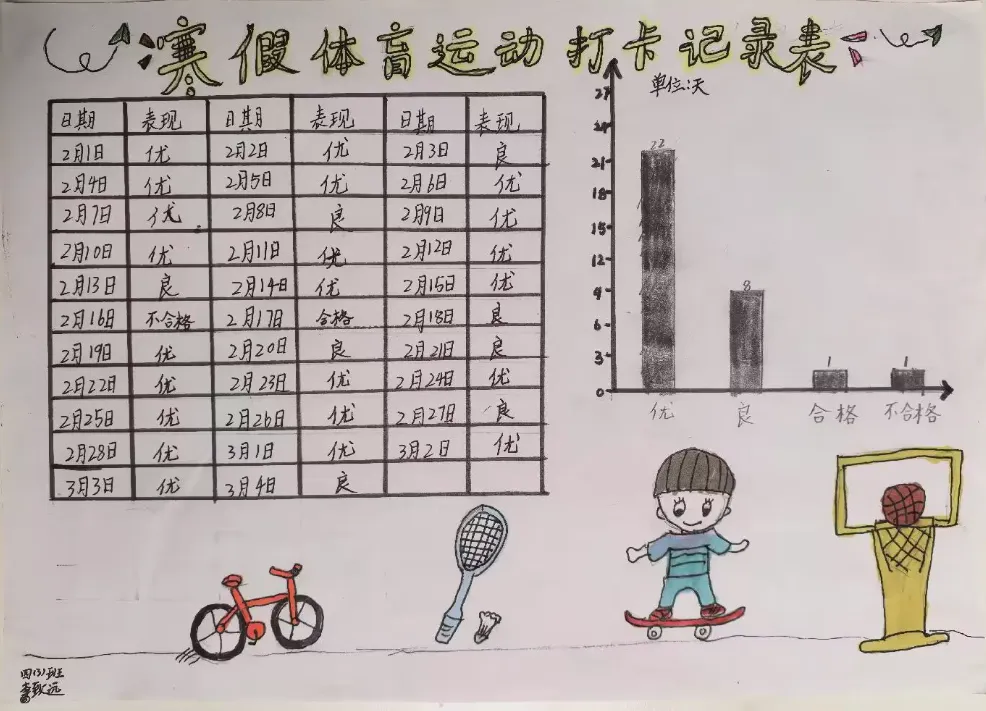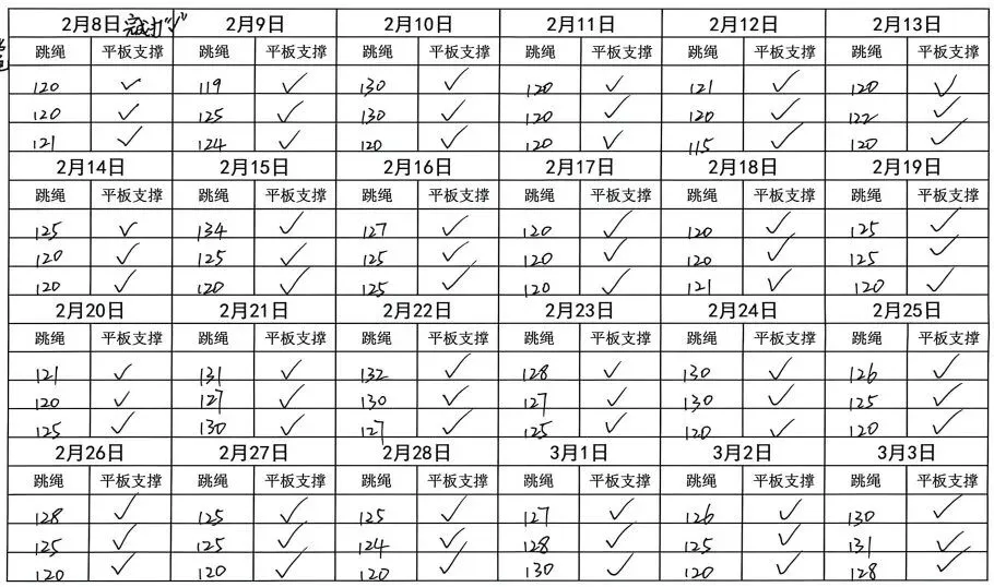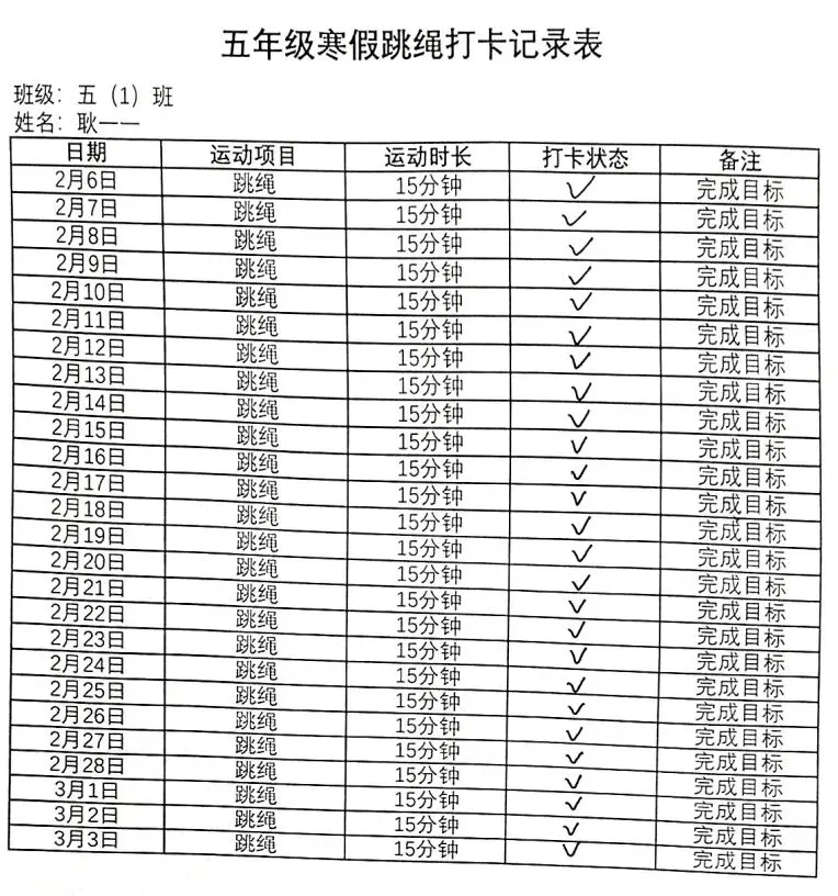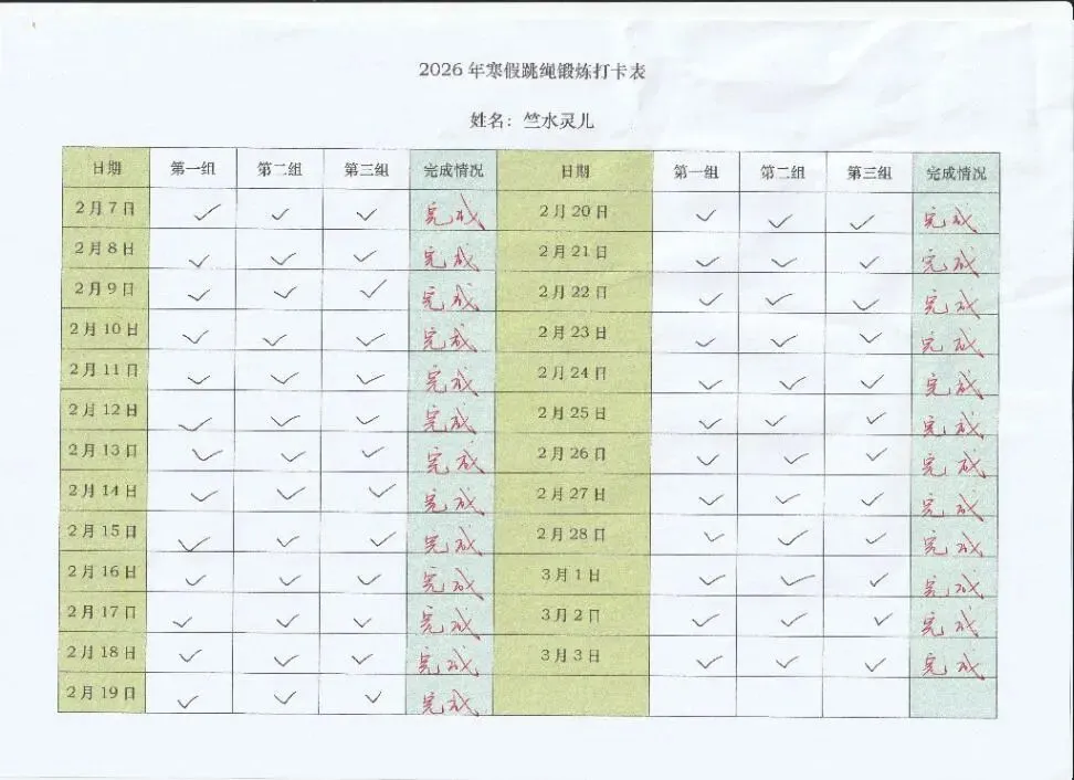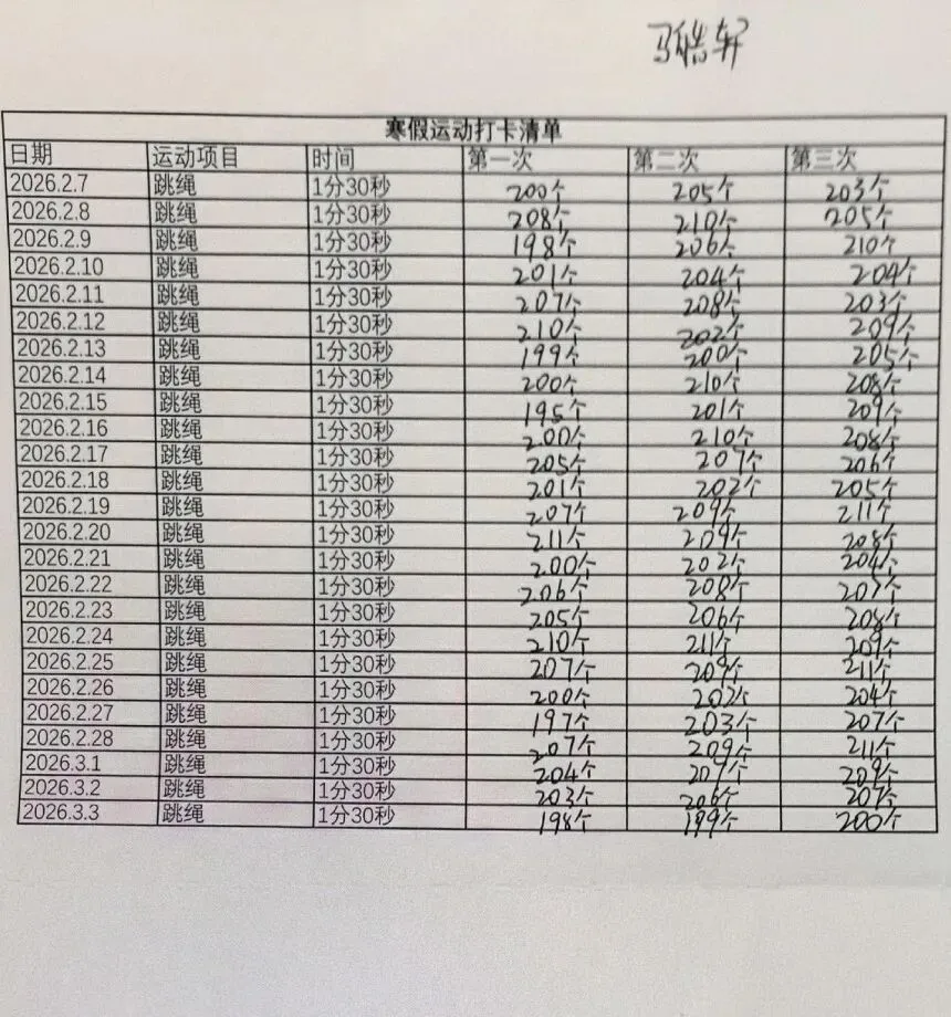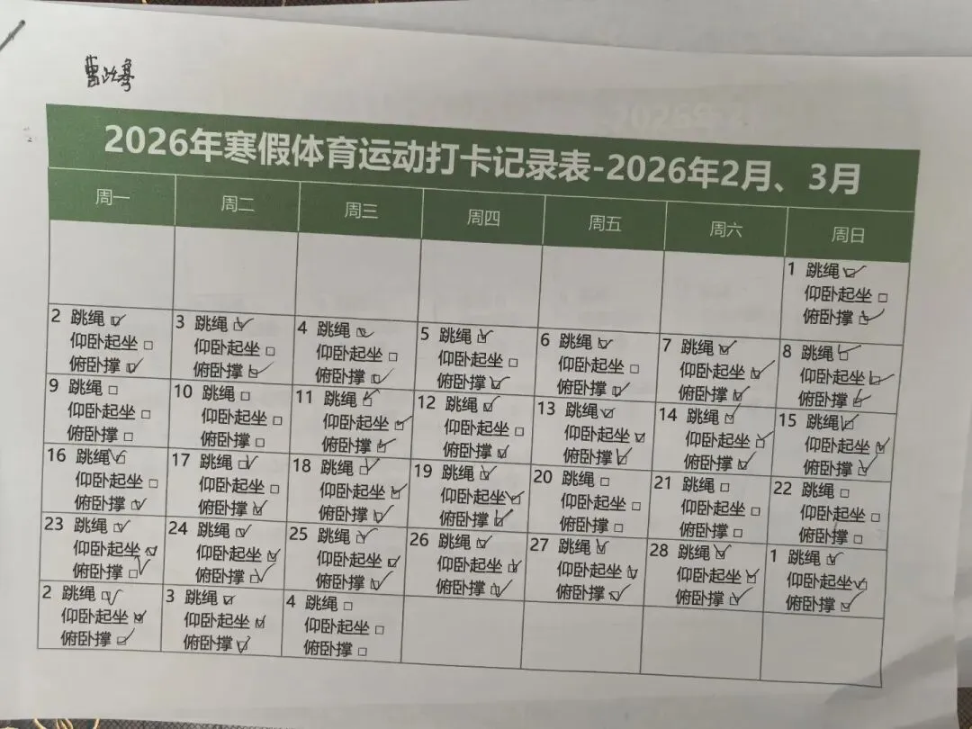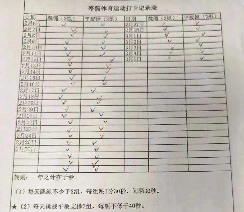 健康的体魄是成长的基石。寒假期间,中高年级同学们积极响应“一年之计在于春”的号召,坚持每日运动打卡。从跳绳挑战到篮球、俯卧撑练习,从个人闯关到亲子双人跳绳,孩子们在汗水中磨练意志,在运动中享受快乐。一张张填满记录的运动打卡表,不仅记录了数据的增长,更见证了“小行家”们坚持不懈的体育精神。