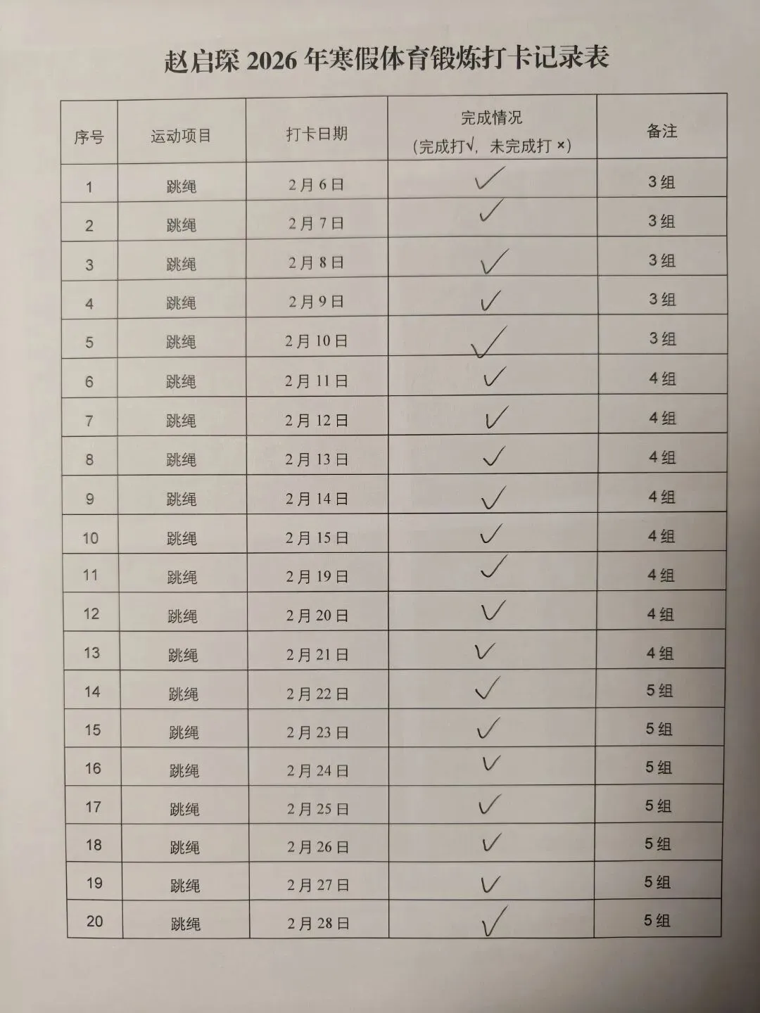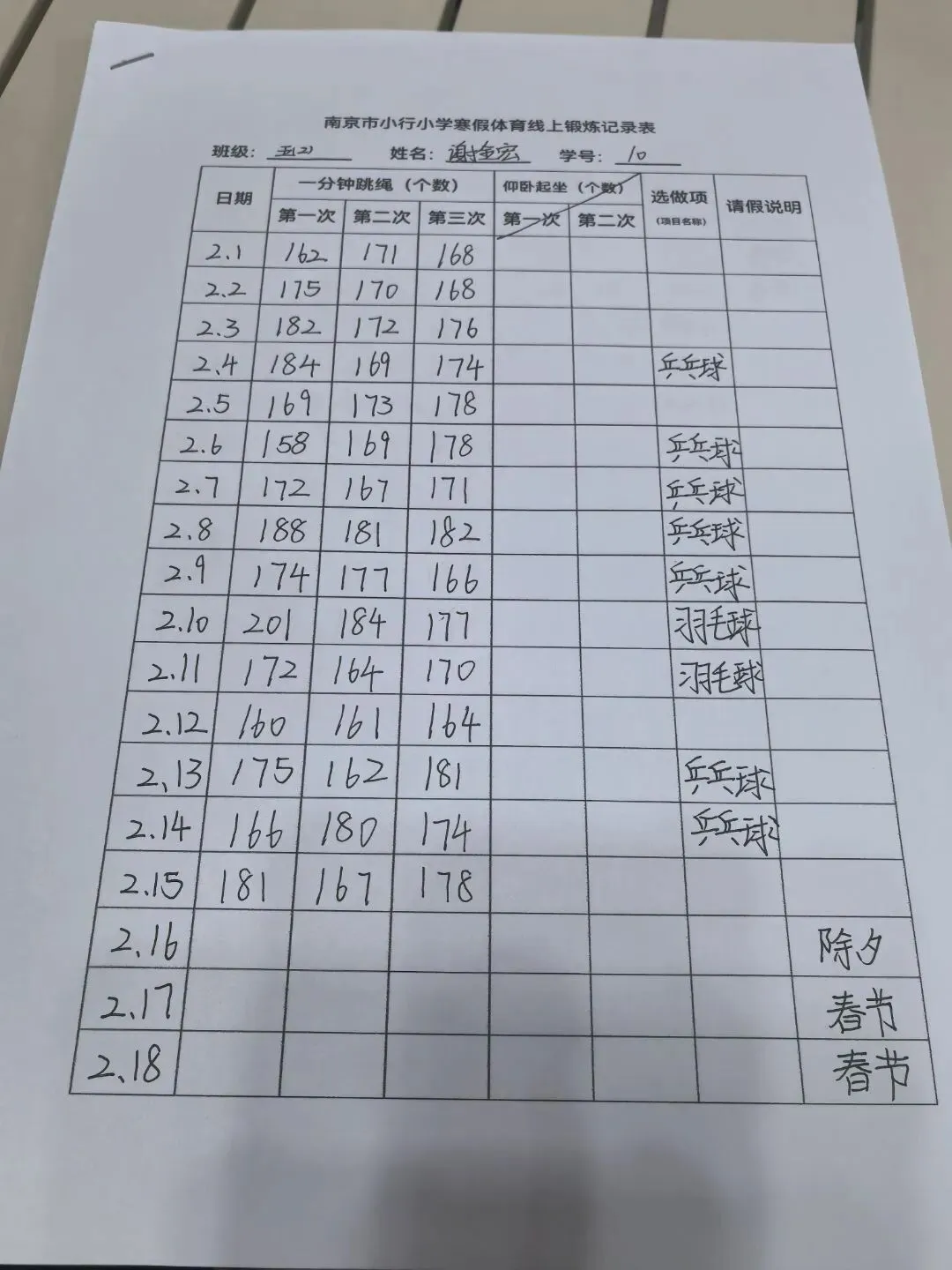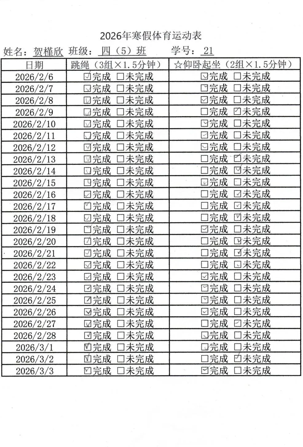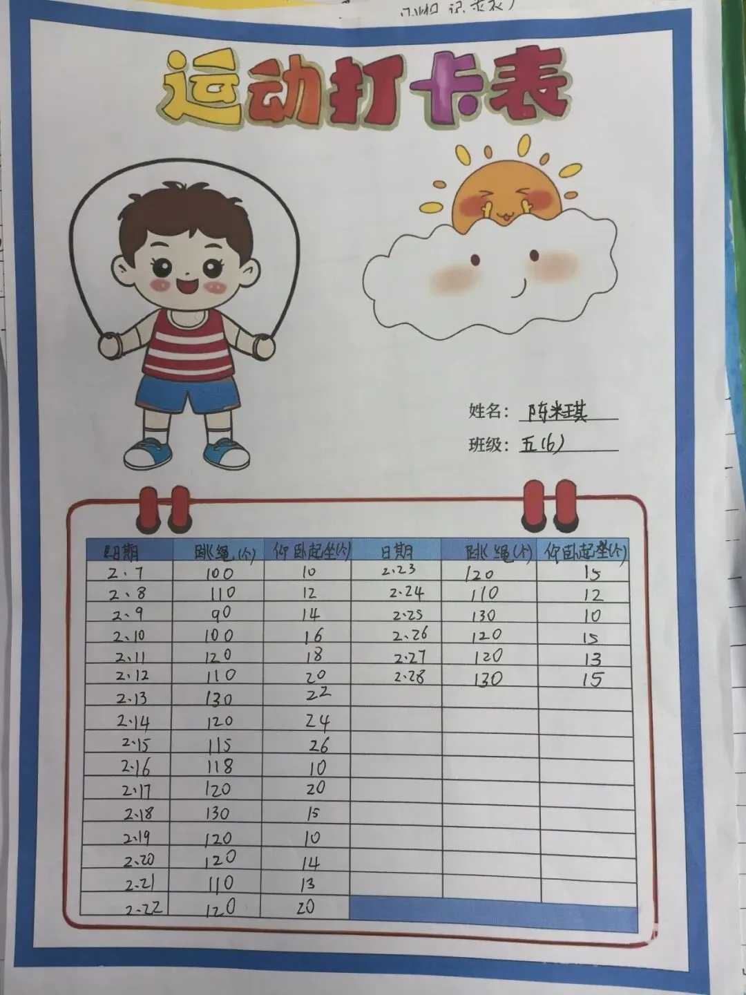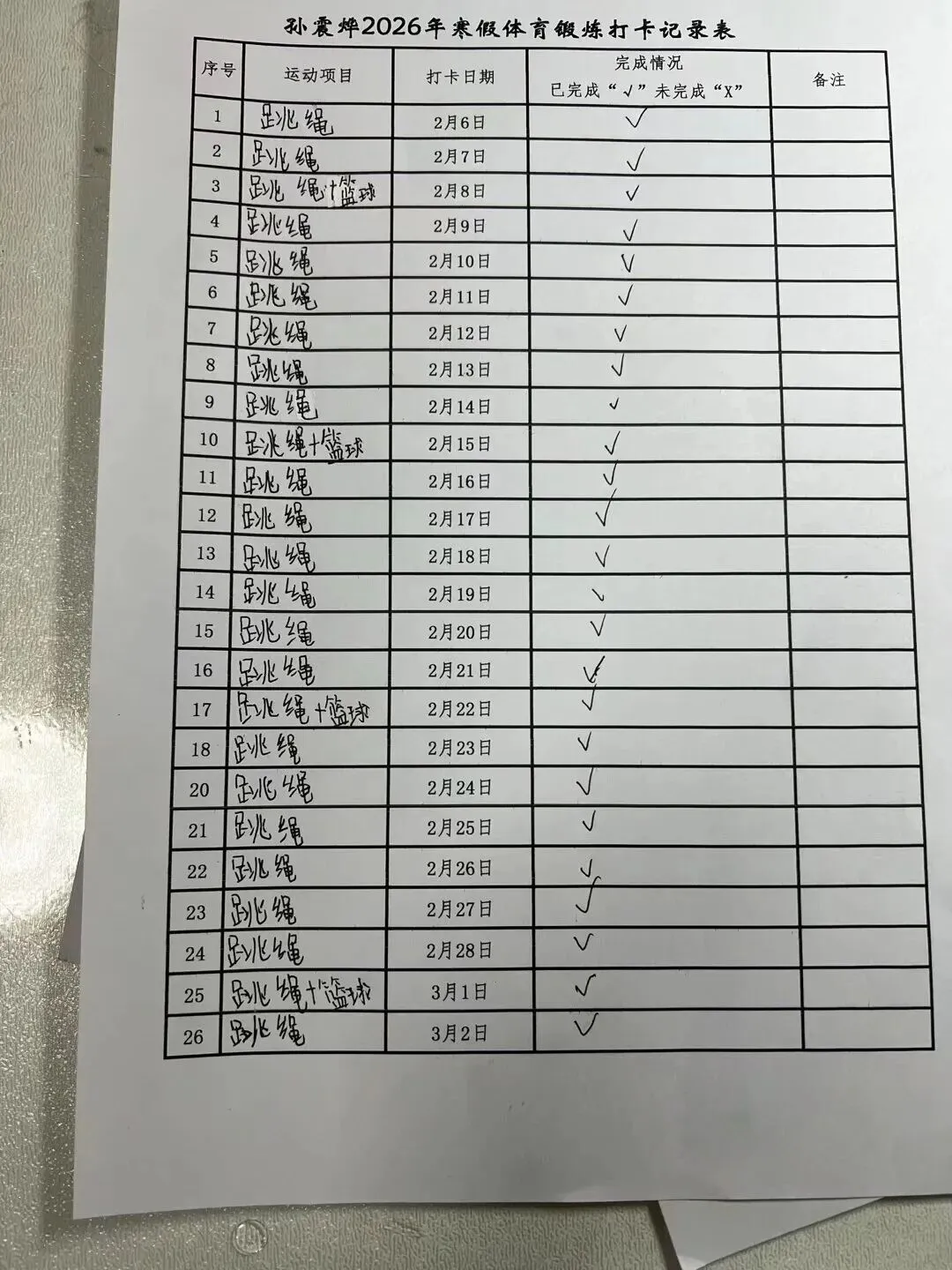 健康的体魄是成长的基石。寒假期间,中高年级同学们积极响应“一年之计在于春”的号召,坚持每日运动打卡。从跳绳挑战到篮球、俯卧撑练习,从个人闯关到亲子双人跳绳,孩子们在汗水中磨练意志,在运动中享受快乐。一张张填满记录的运动打卡表,不仅记录了数据的增长,更见证了“小行家”们坚持不懈的体育精神。