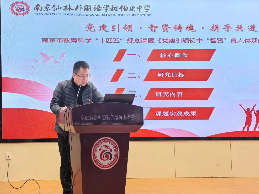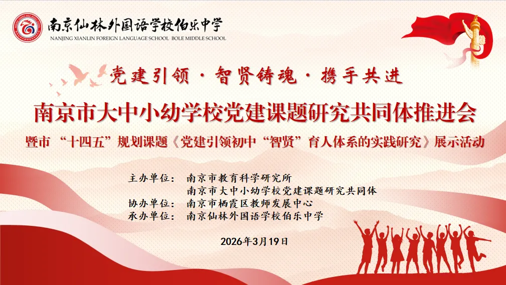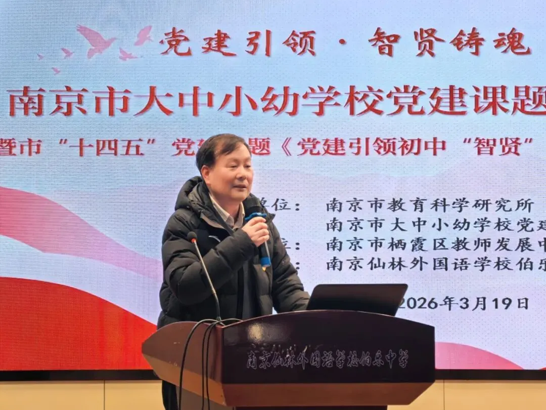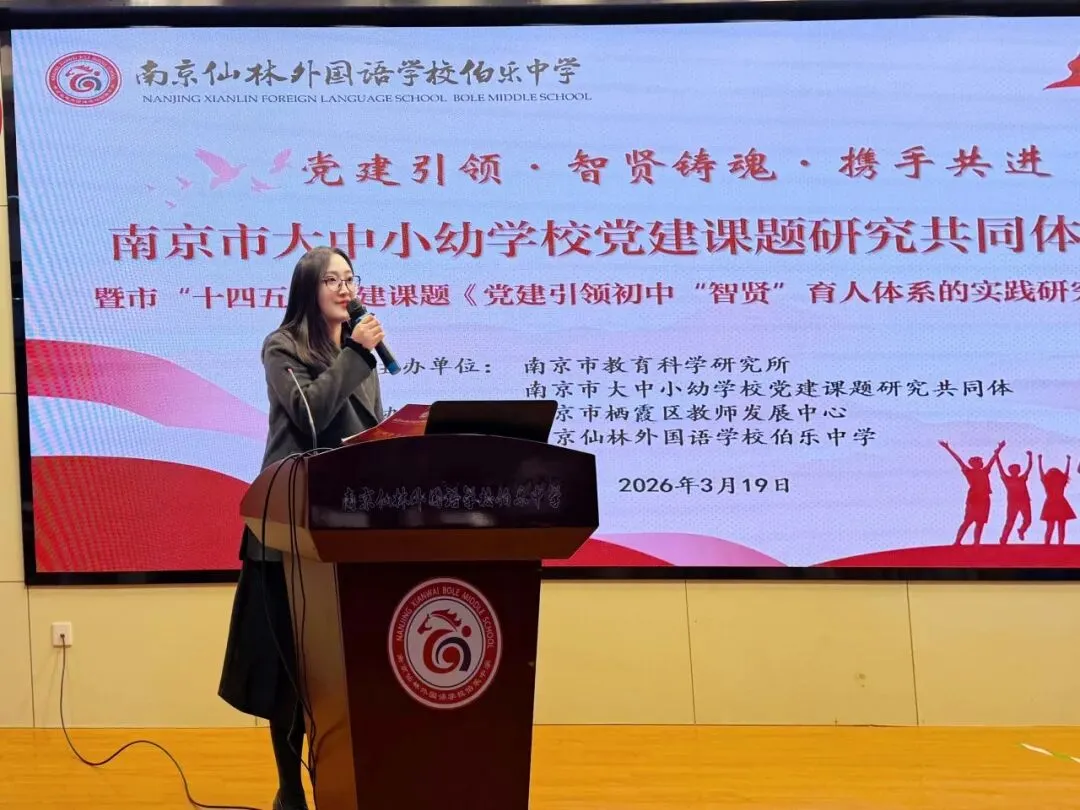 春风化雨润初心,党建引领铸师魂。2026年3月19日下午,南京市大中小幼学校党建课题研究共同体推进会暨市级“十四五”党建规划课题《党建引领初中“智贤”育人体系的实践研究》展示活动,在南京仙林外国语学校伯乐中学隆重举行。本次活动旨在深化党建与教育教学的融合,探索“课堂、课程、课题”三课联动的校本化育人新机制。