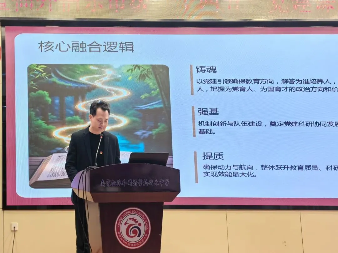 南京市教育科学研究所朱小琥书记,南京市栖霞区教师发展中心张迎东校长、教育科研处陈从银老师,南京仙林外国语学校伯乐中学党支部沈方晓书记、王大军校长、王娟副校长、戴宾副校长、陈刚副校长,以及南京市大中小幼党建课题研究共同体代表、栖霞区在研课题组成员和仙外伯乐教师代表齐聚一堂,共话教育党建新篇章。活动由仙外伯乐吴越老师主持。