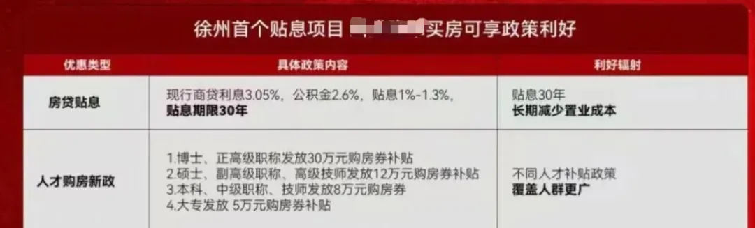 其实早在今年1月,徐州就已经出现“房贷贴息”相关宣传,某国企开发楼盘推出:在现行商贷利率3.05%、公积金利率2.6%的基础上,贴息1%-1.3%,贴息期限30年。但名额有限。