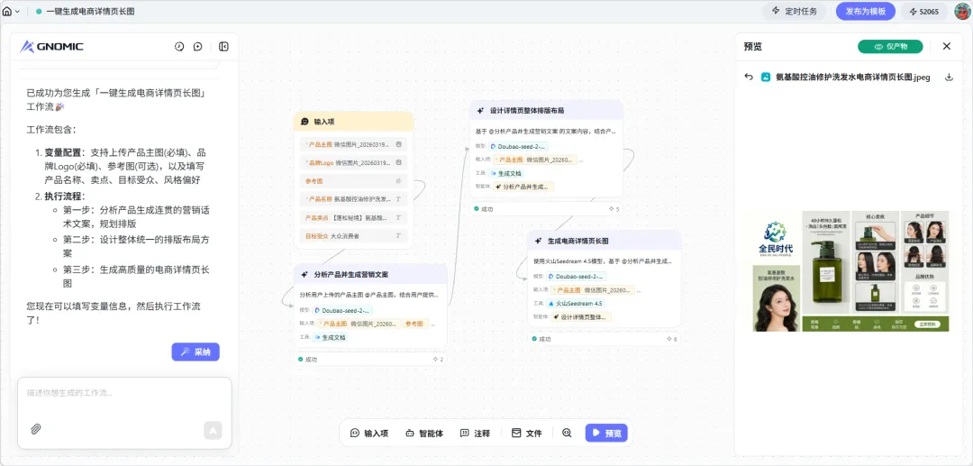 在实战演示环节,郭冉基于现场企业需求,依托 Gnomic 平台完成电商选品、营销生成、内部提效三类智能体搭建演示,完整展示需求拆解、技能封装、接口调用全流程,让参会者直观感受零代码、高效率的智能体落地能力。