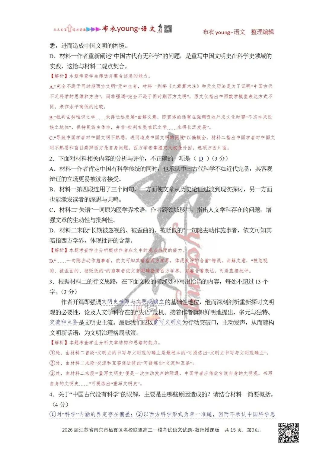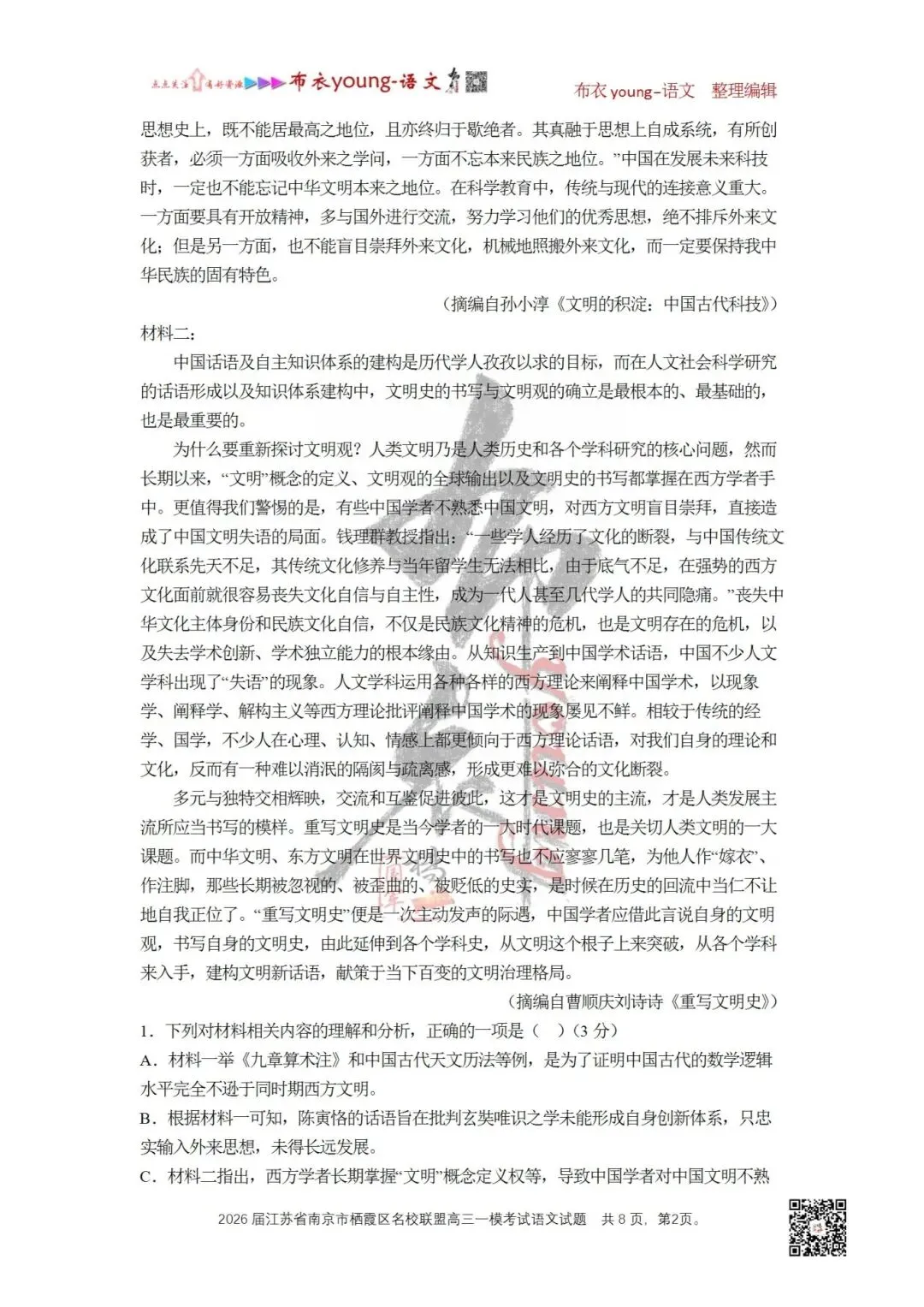 D.材料二末段“长期被忽视的、被歪曲的、被贬低的”一句隐去动作施事者,依文可知其暗指西方学界,体现批评的含蓄。