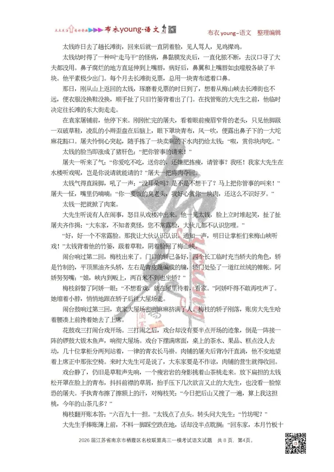 在袁家屠铺前,他停下来。刚刚忙完的屠夫,看着眼前瘦眉窄骨的老头,只见他脚趿一双破草鞋,凌乱的小辫歪盘在后脑上,眼下罩块青布,风一吹,便露出鼻子下的一大坨麻花豁口。屠夫怜悯心突起,随手拣了一块卖剩的下水肉扔给太钱:“呶,赏你块肉吃。”