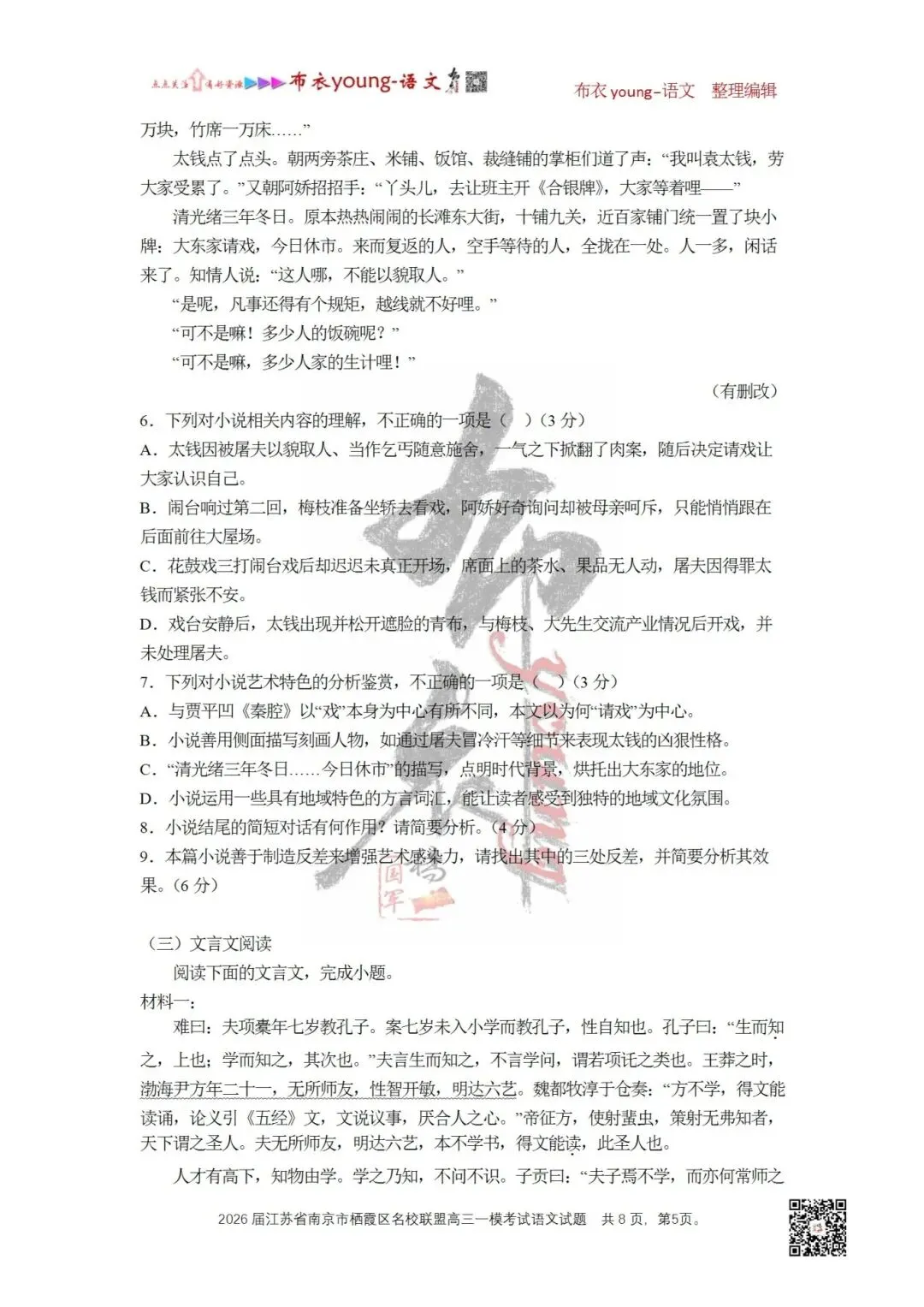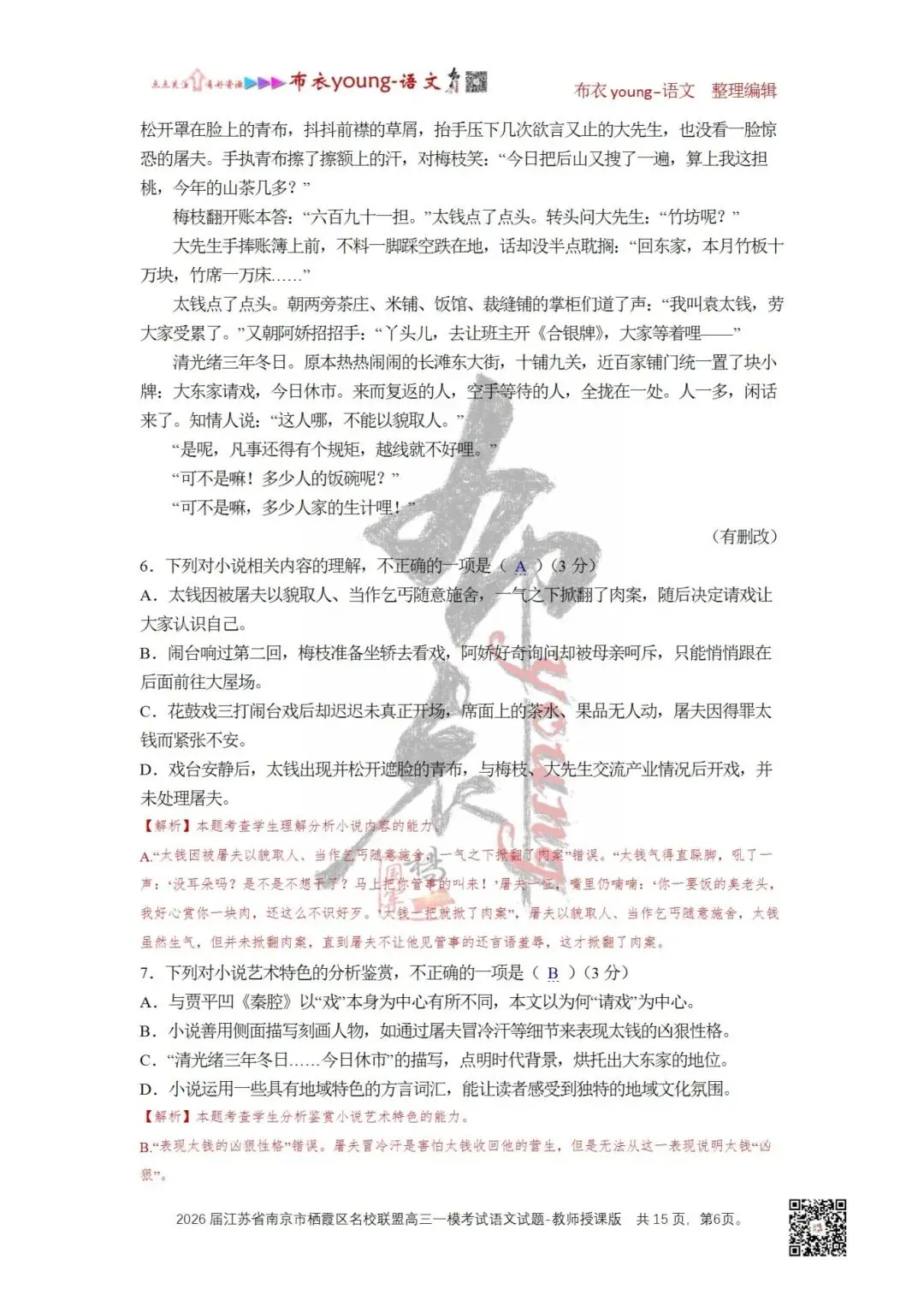 6.下列对小说相关内容的理解,不正确的一项是()(3分)