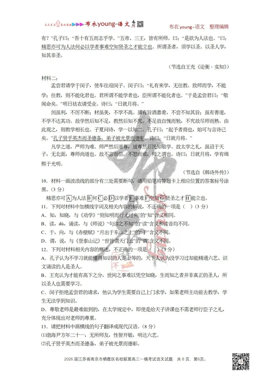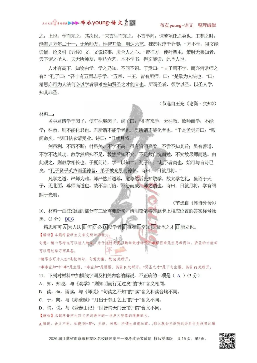 11.下列对材料中加横线字词及相关内容的解说,不正确的一项是()(3分)