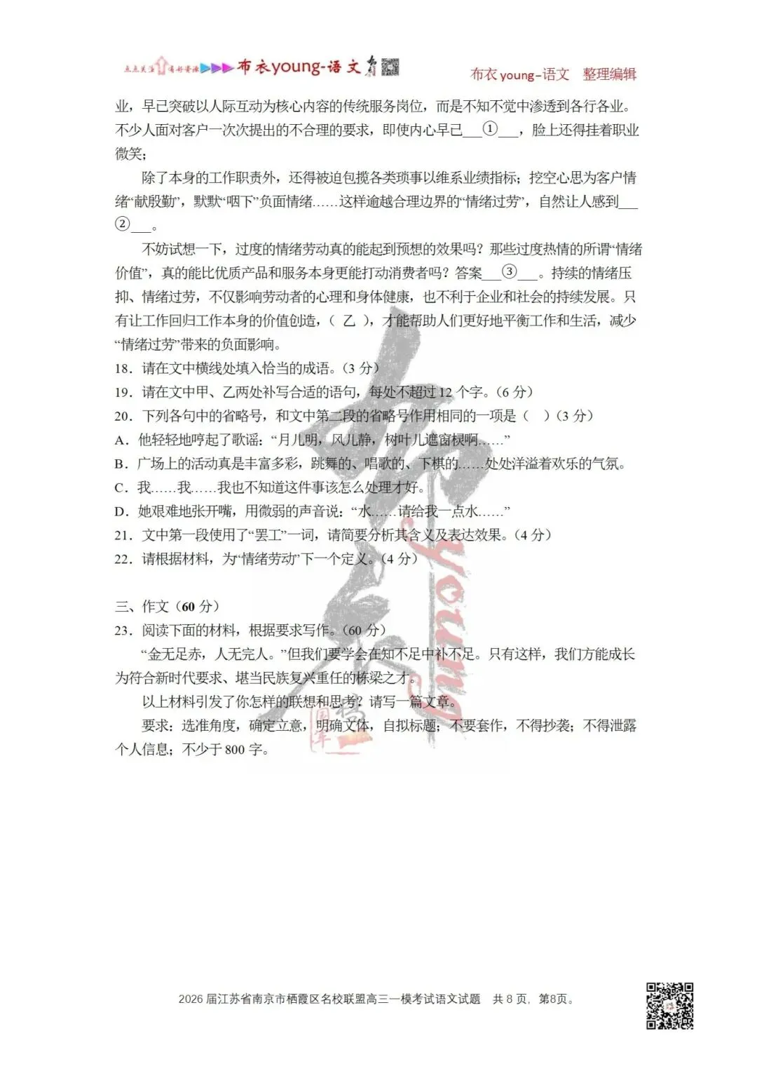 22.请根据材料,为“情绪劳动”下一个定义。(4分)