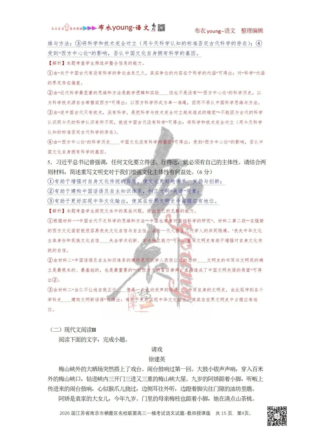 5.习近平总书记曾强调,任何文化要立得住、行得远,就必须有自己的主体性。请结合两则材料,简述重写文明史对于我们增强文化主体性有何益处。(6分)