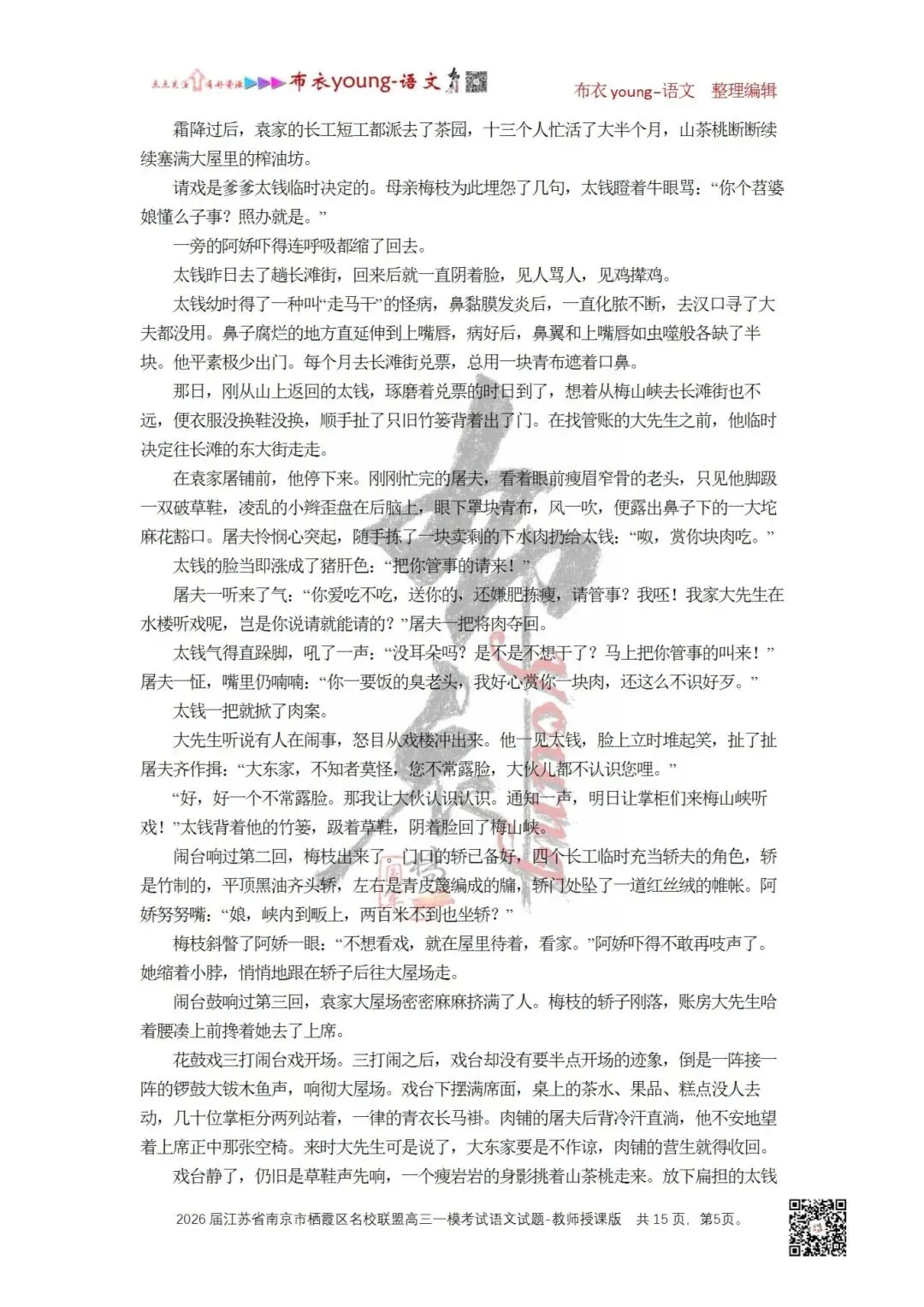 戏台静了,仍旧是草鞋声先响,一个瘦岩岩的身影挑着山茶桃走来。放下扁担的太钱松开罩在脸上的青布,抖抖前襟的草屑,抬手压下几次欲言又止的大先生,也没看一脸惊恐的屠夫。手执青布擦了擦额上的汗,对梅枝笑:“今日把后山又搜了一遍,算上我这担桃,今年的山茶几多?”