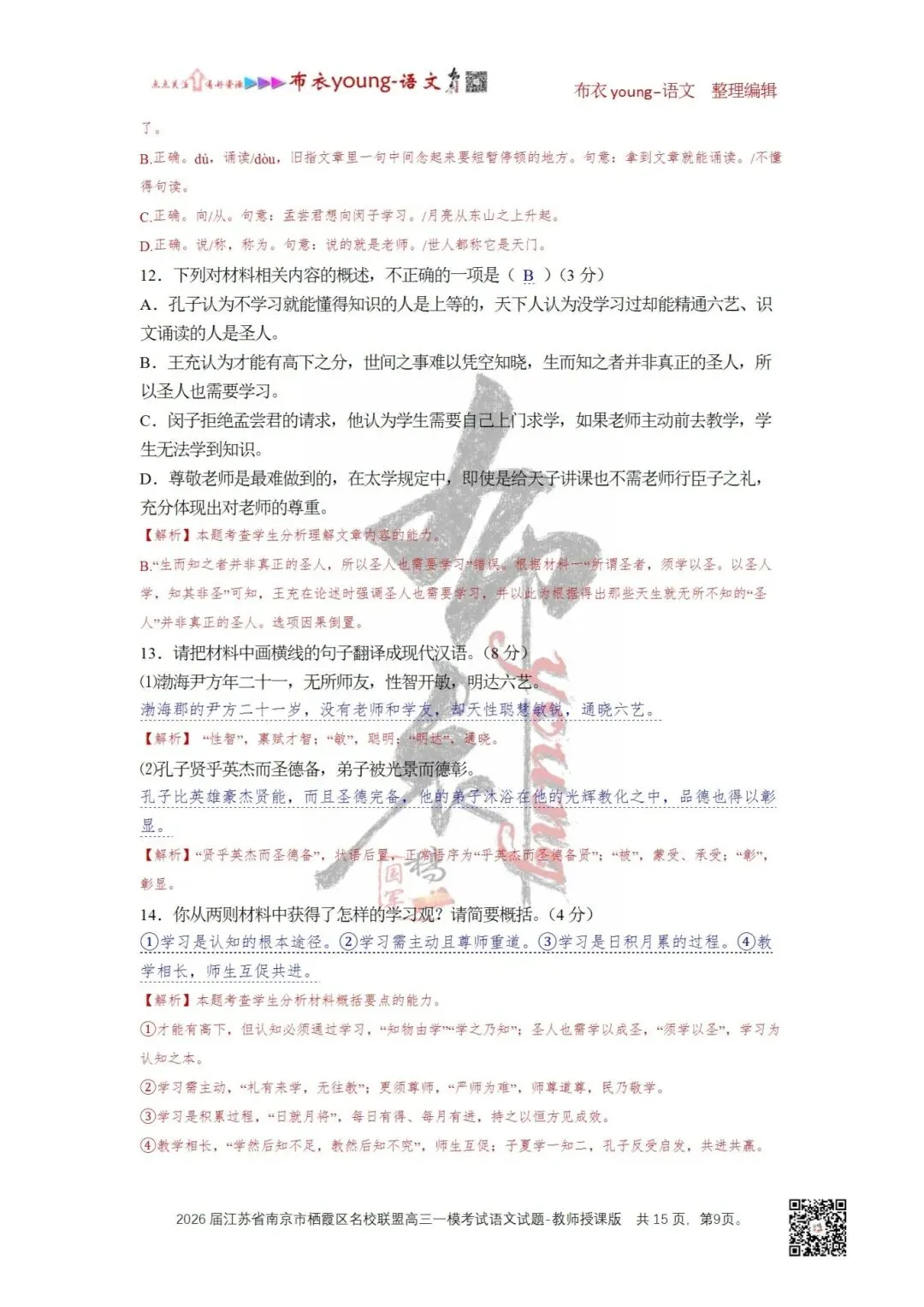 14.你从两则材料中获得了怎样的学习观?请简要概括。(4分)