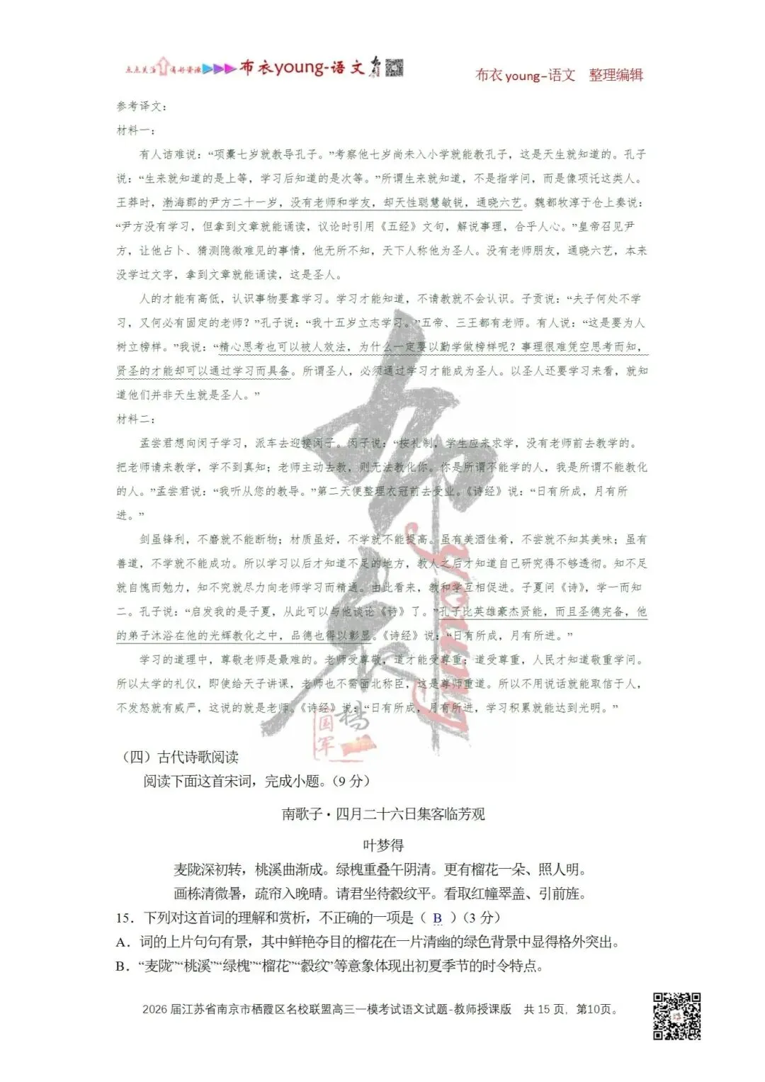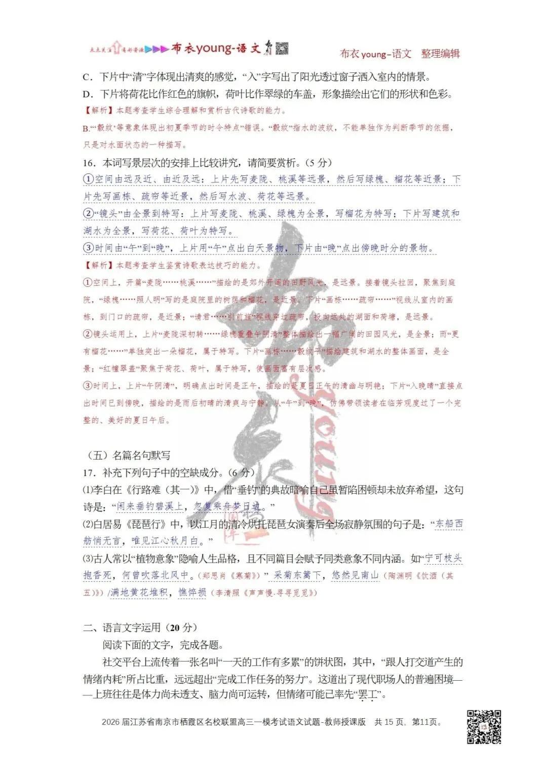 15.下列对这首词的理解和赏析,不正确的一项是()(3分)