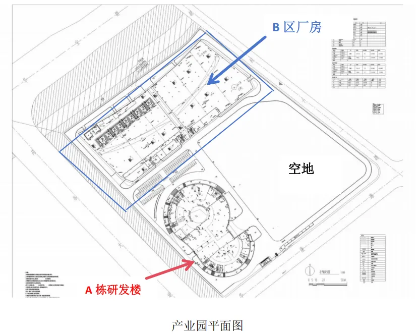 产业园区整体面积 76,861.32(115.3 亩),包含生产厂房、研发办公楼、未开发空地等区域: