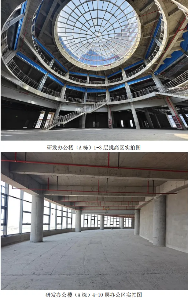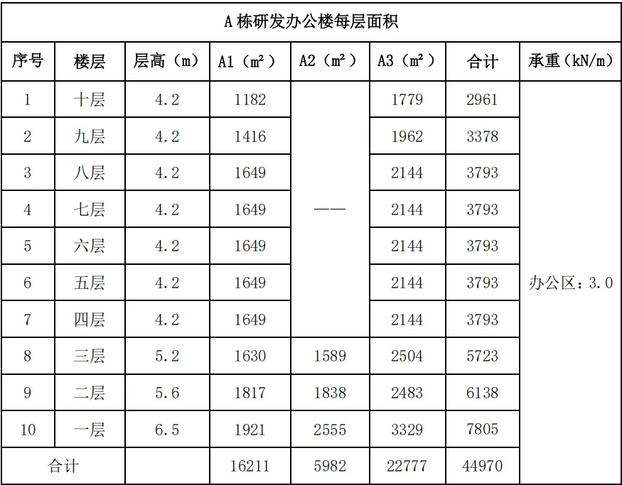 (3) 研发办公楼(A 栋):总面积约 4.5 万平米,分两栋塔楼(1~3 层相连),每栋塔楼共计 10 层。研发办公楼空间充足,可整体布局,A 栋各层参数如下表所示: