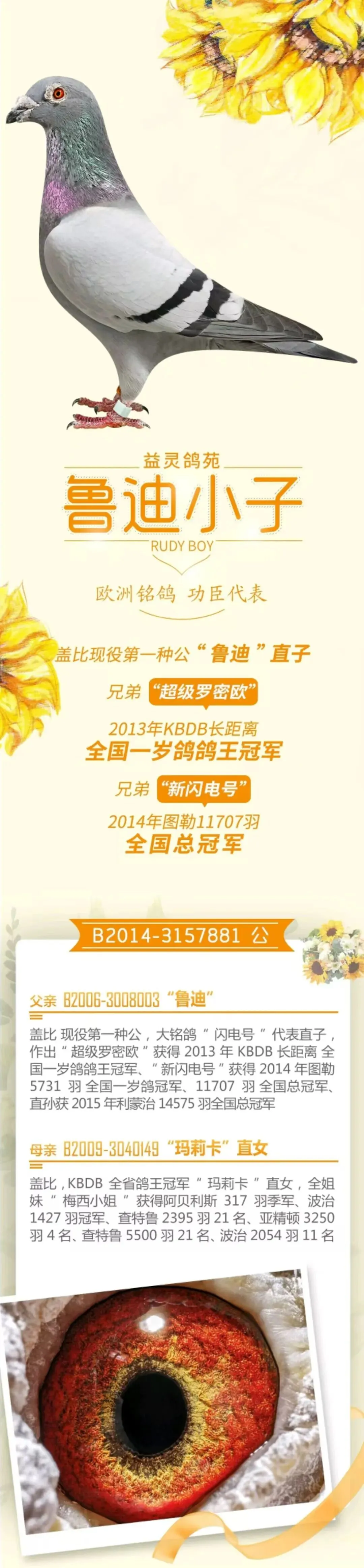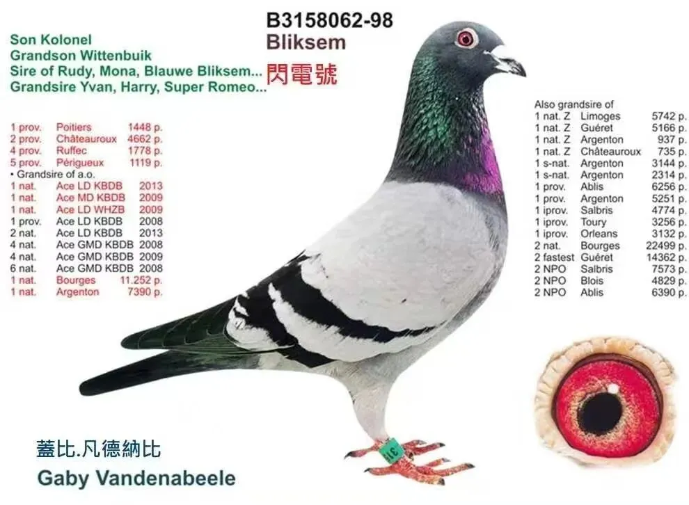 作出“超级罗密欧”获得2013年KBDB长距离全国一岁鸽王冠军,“新闪电号”2014年图勒全国11707羽总冠军,5371羽全国一岁鸽王冠军;直孙2015年利蒙治14575羽全国总冠军
