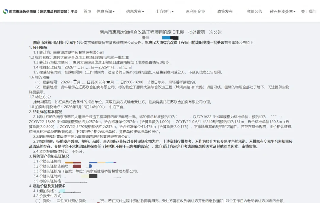 南京环境集团此次受拍卖方委托,对惠民大道综合改造工程项目废旧电缆一批开展全流程公开拍卖处置。通过平台官网、集团公众号等渠道扩大传播力,最终吸引20家优质客户成功报名,形成充分的市场竞争格局。