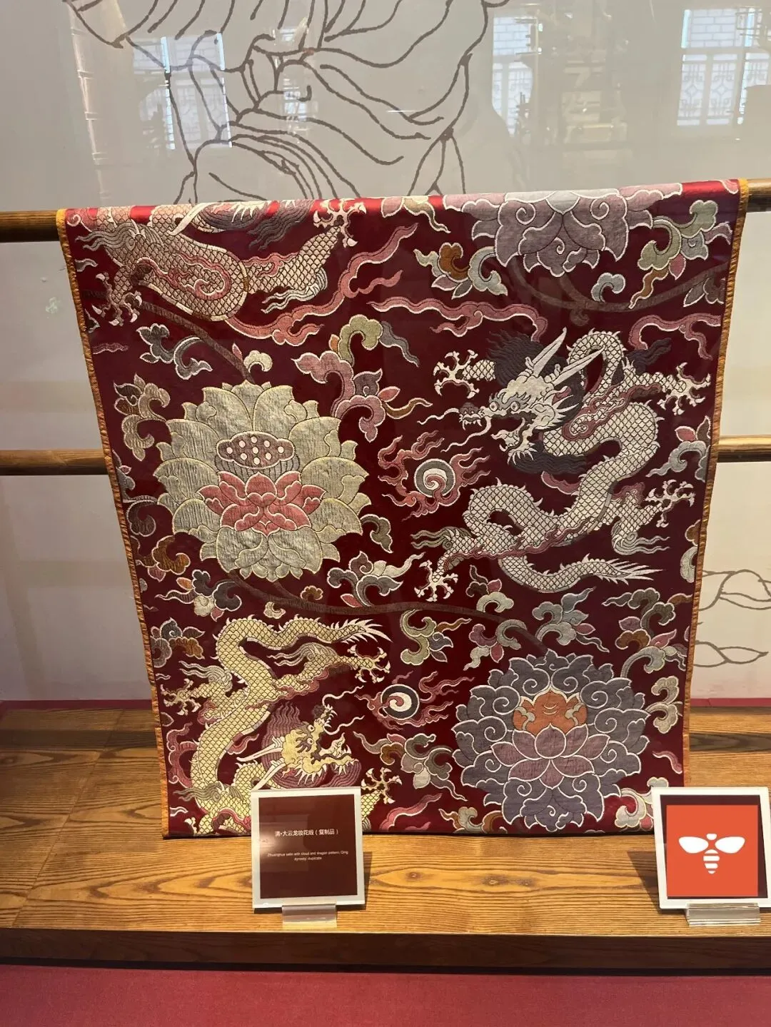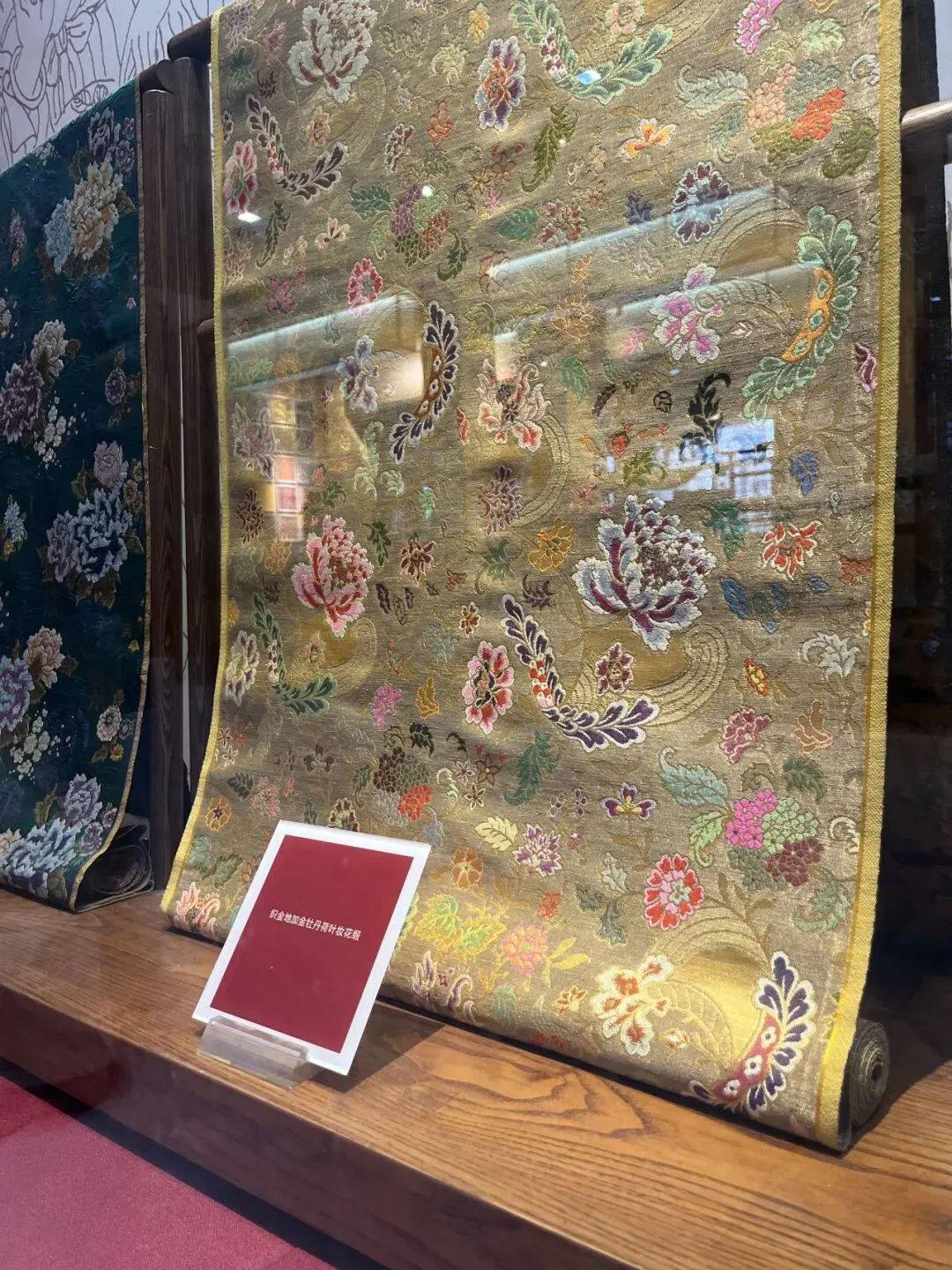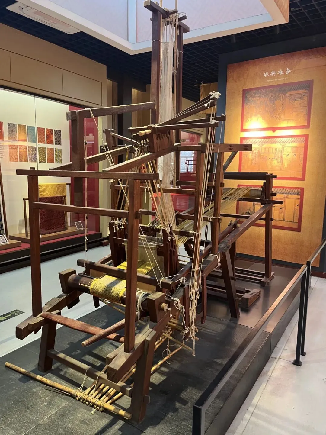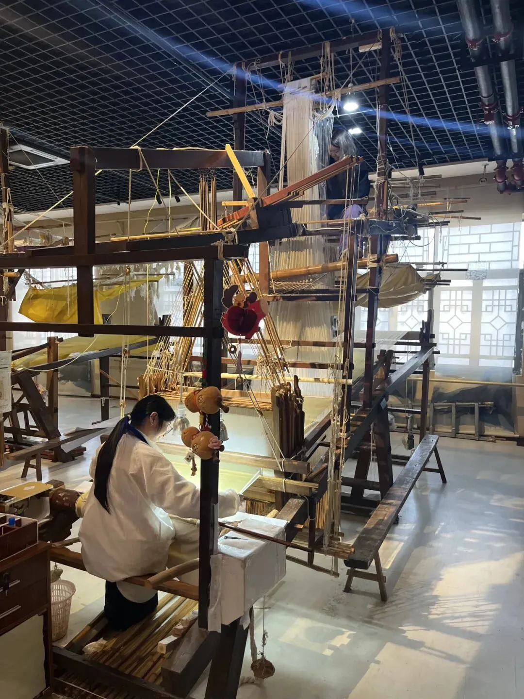 最后是上机织造。云锦被誉为 “锦中之冠”,其织造使用巨大的传统木质大花楼织机(花楼机),机身长约5.6米、高逾4米。织造过程需要两人密切配合: